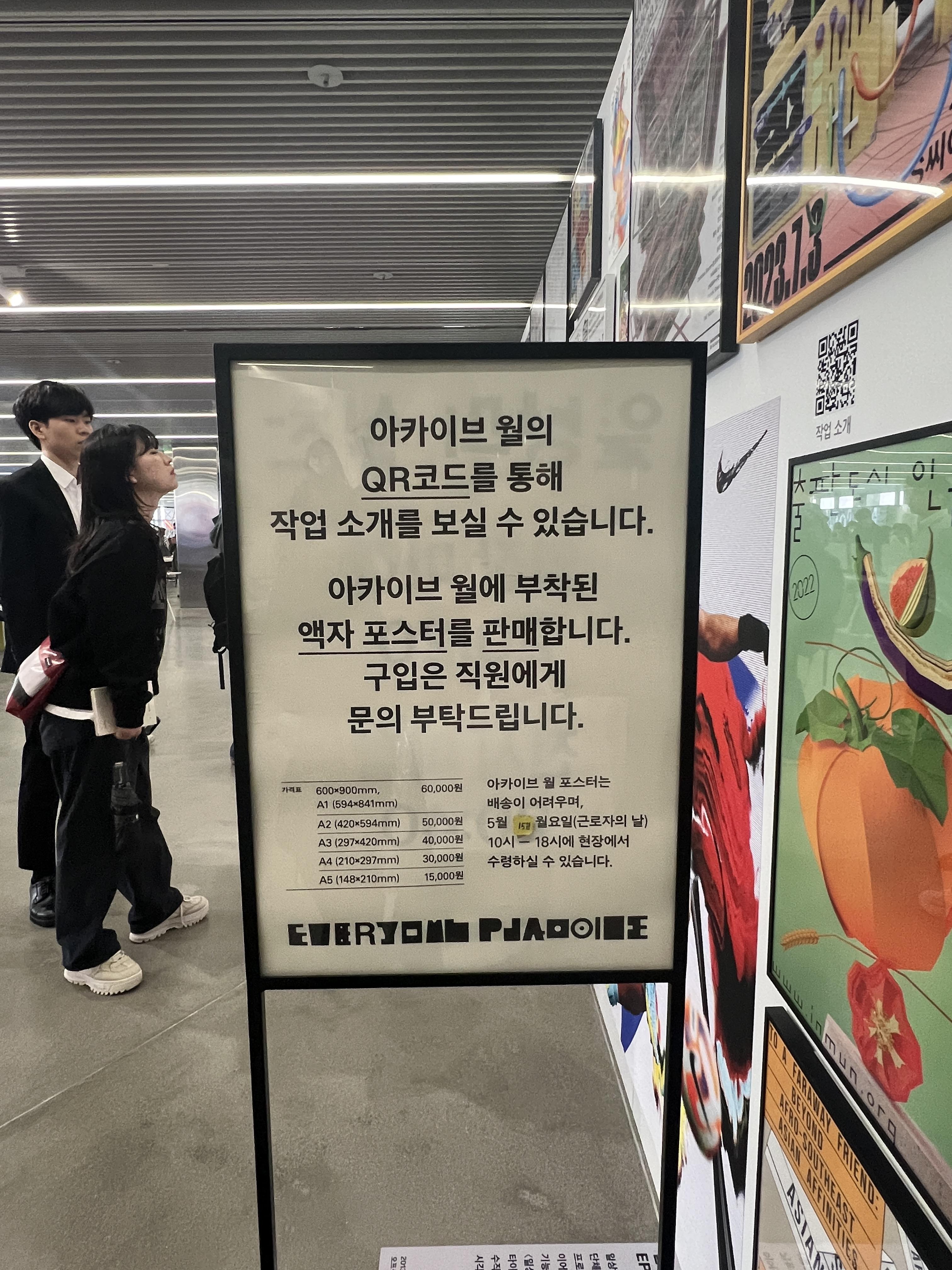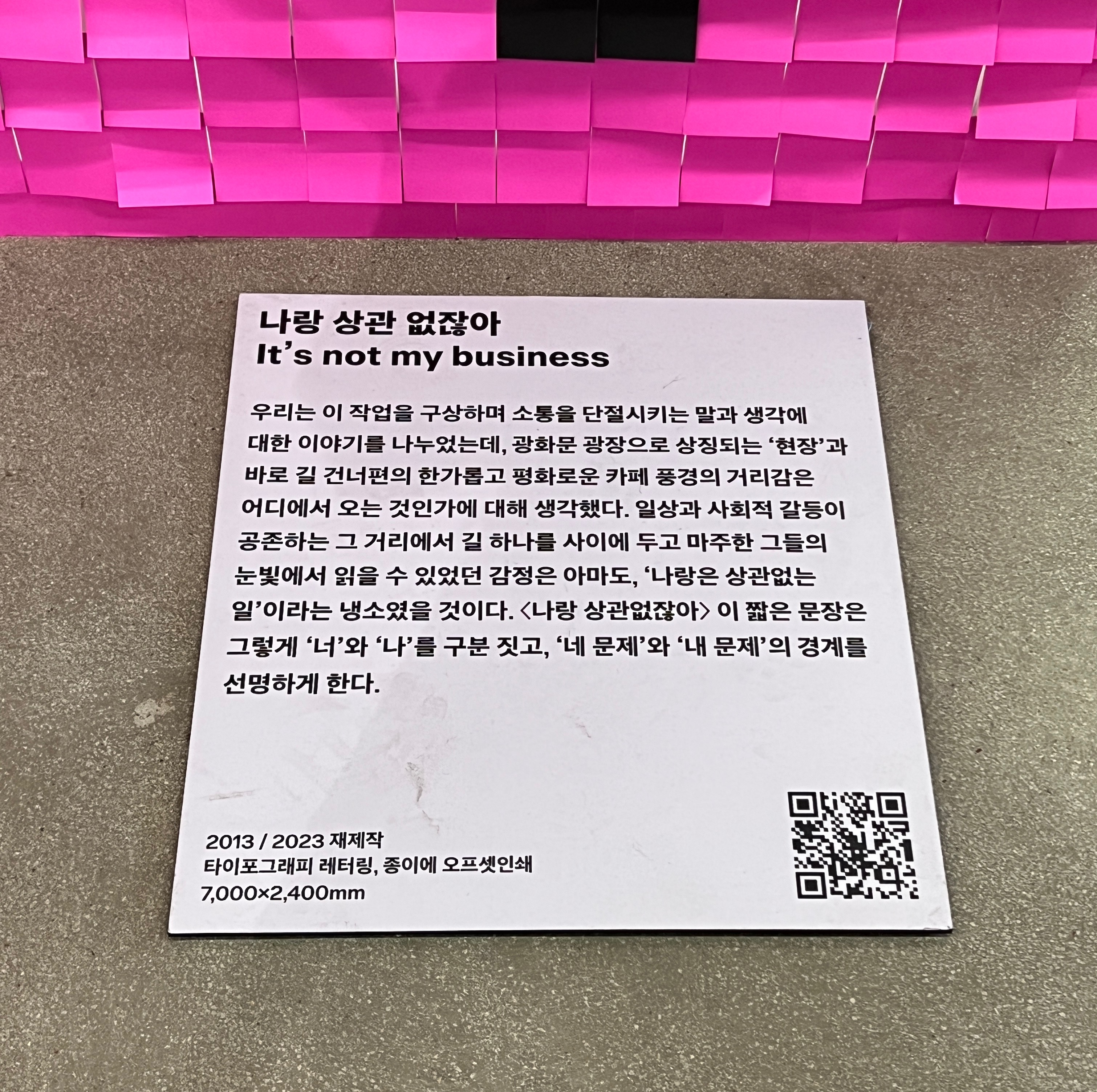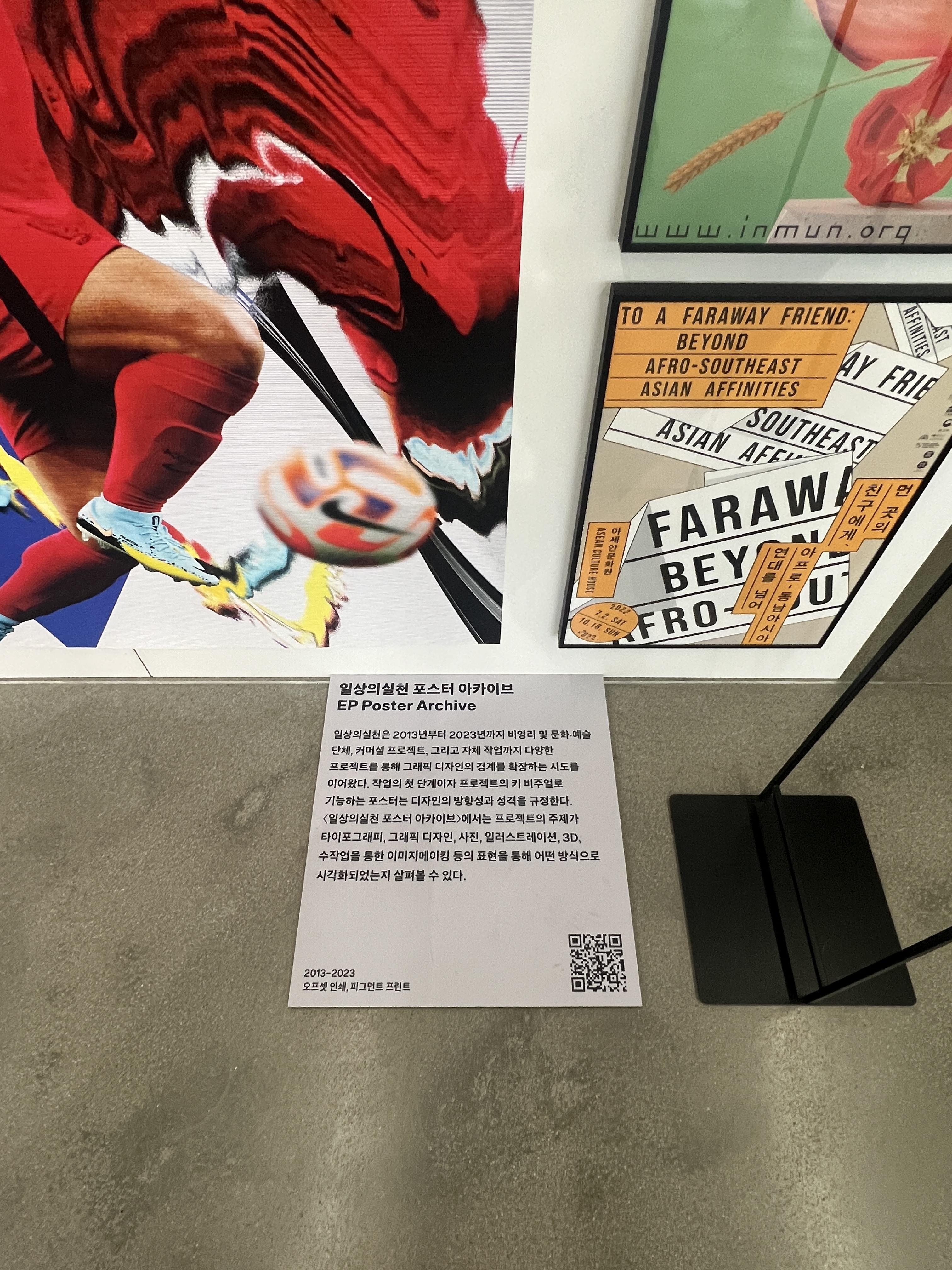 바닥과 포스터 사이 사이에 아주 친절하게 작품을 웹에서도 볼 수 있는 작품설명 QR이 있었다. **QR로 이어지는 아카이브 월