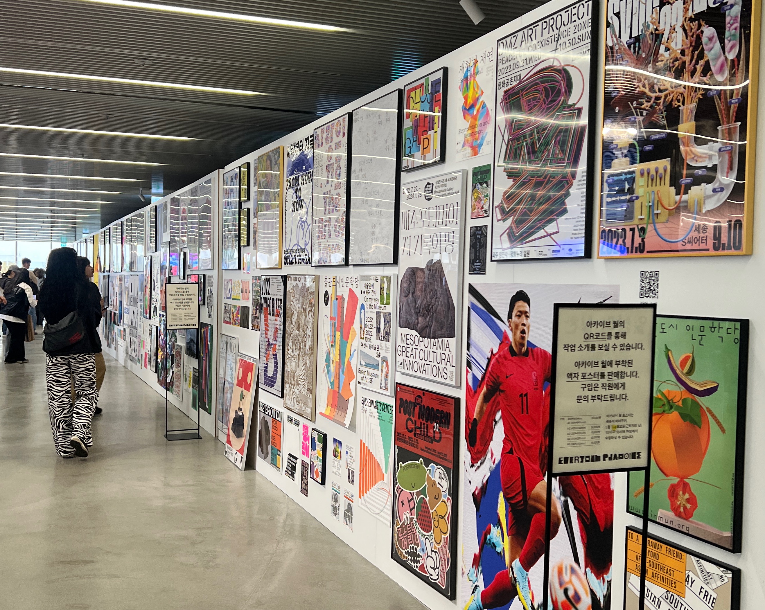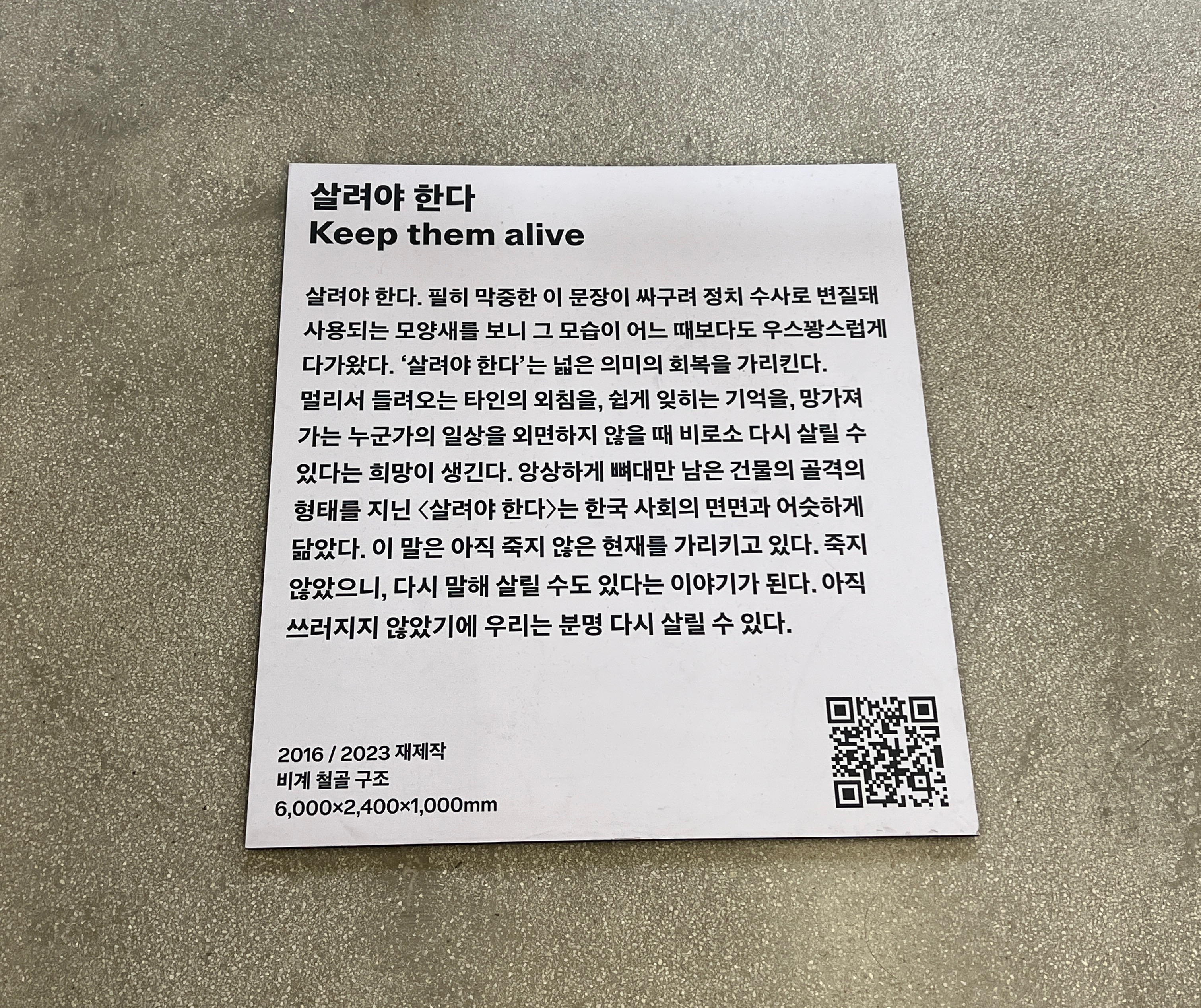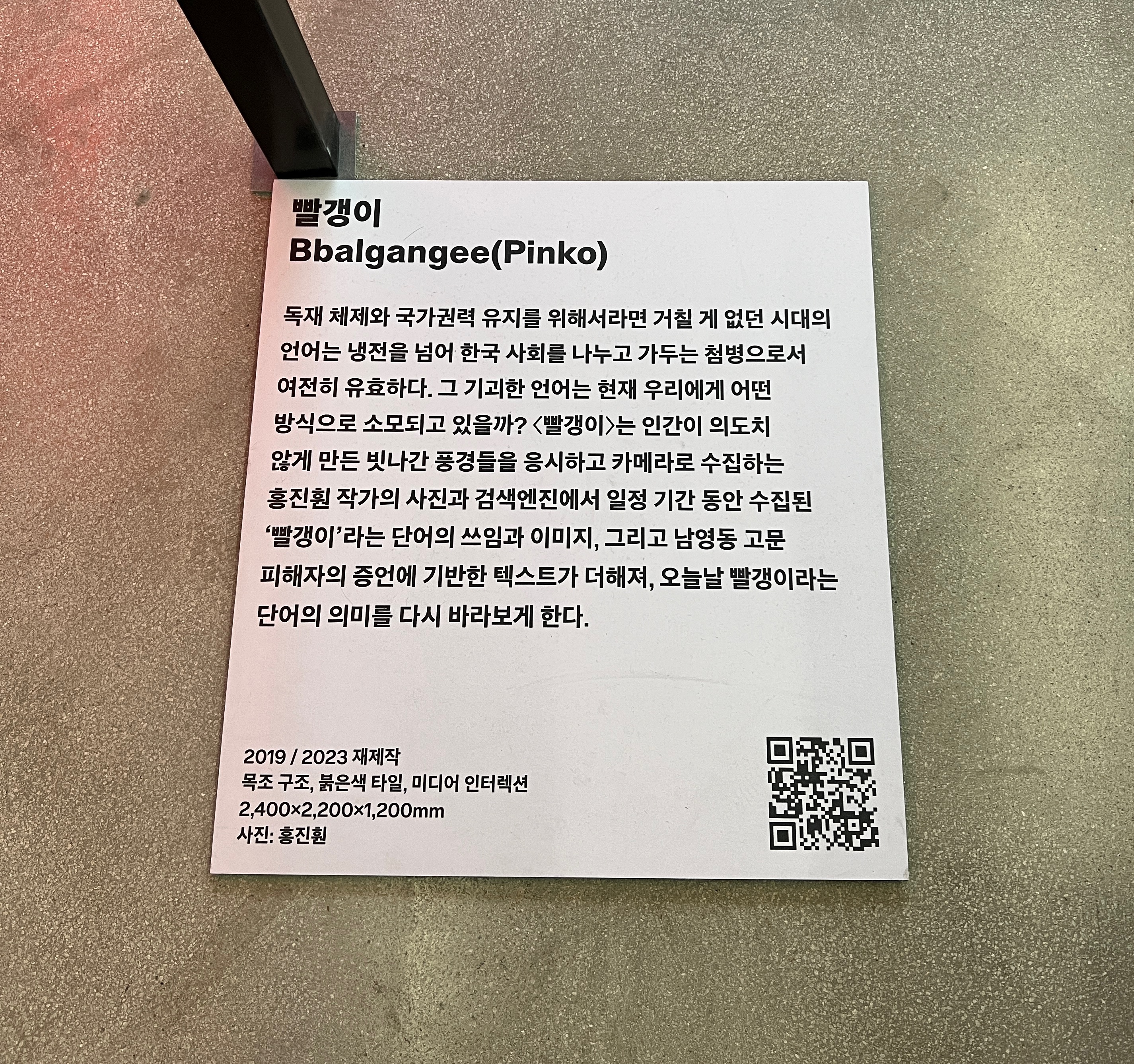 바닥과 포스터 사이 사이에 아주 친절하게 작품을 웹에서도 볼 수 있는 작품설명 QR이 있었다. **QR로 이어지는 아카이브 월