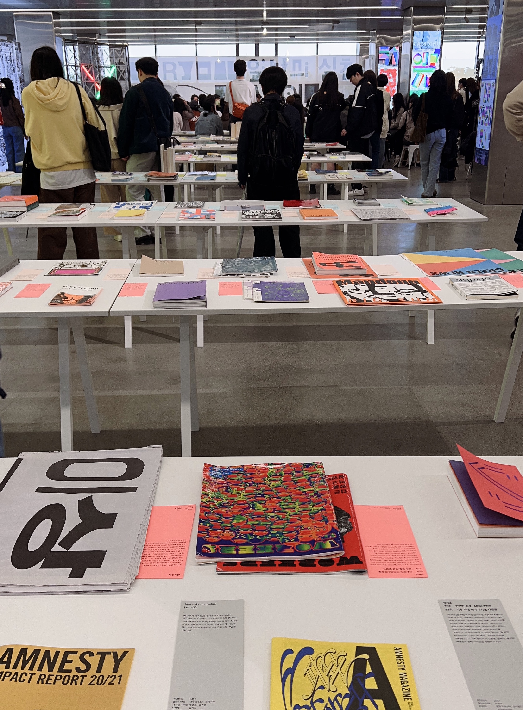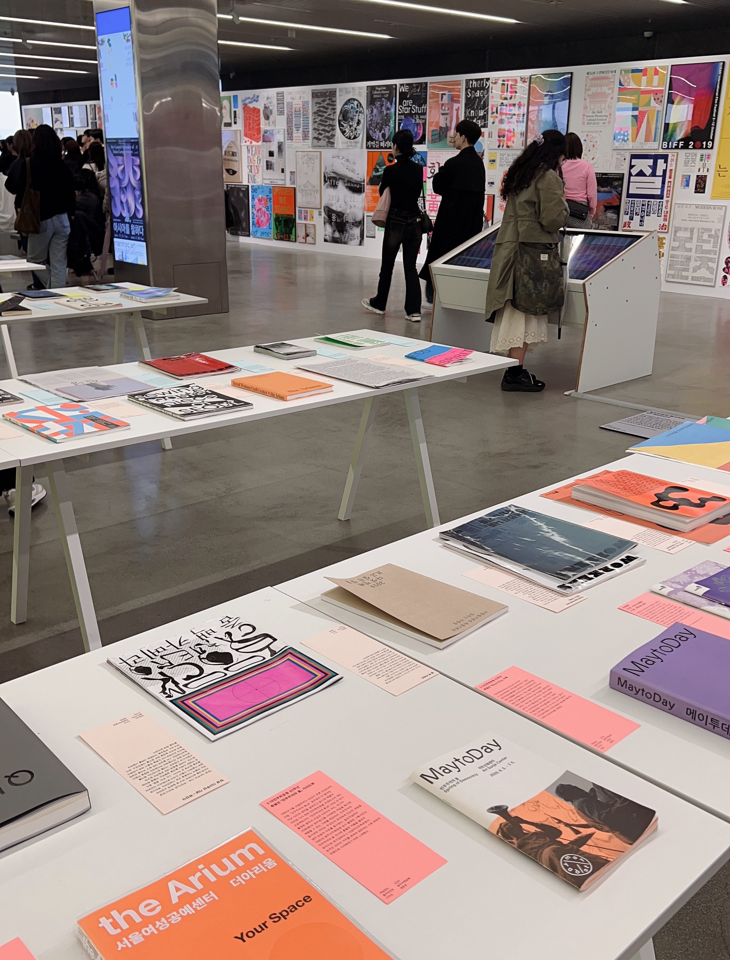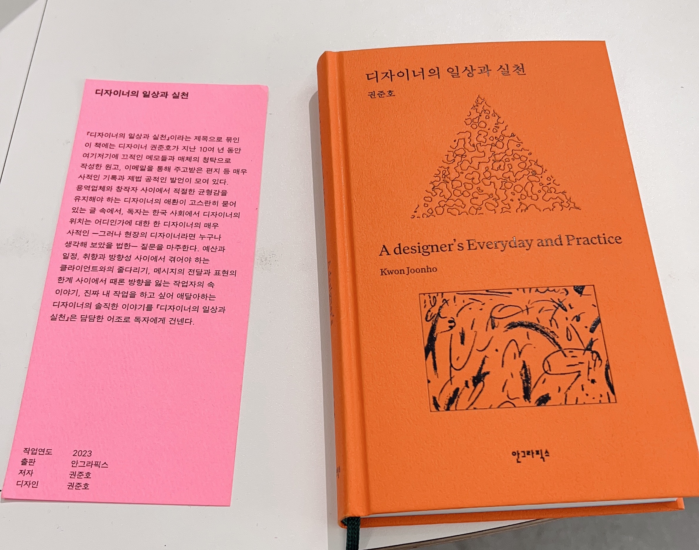손으로 만져보고 직접 볼 수 있는 책들과 리플렛 결과물을 볼 수 있는 공간이 마련되어 있다. 잡지, 도록, 출간 에세이집 등의 많은 결과물들을 하나의 작품처럼 캡션과 설명이 표시되어 있다. 작업자(디자이너)는 누구인지, 작업연도, 클라이언트, 도움을 준 사람, 그리고 제작한 내용은 무엇이며 어떻게 표현했는지 등 작업자의 시각으로 설명이 자세히 적혀있다. 너무 많아서 모든 설명을 읽어보지 못해 아쉽다. 방문했을 때는 전시연계 토크 장소에 의자를 사용하고 있어서 서서 보았지만, 프로그램이 없을 때는 편히 앉아서 볼 수 있다.