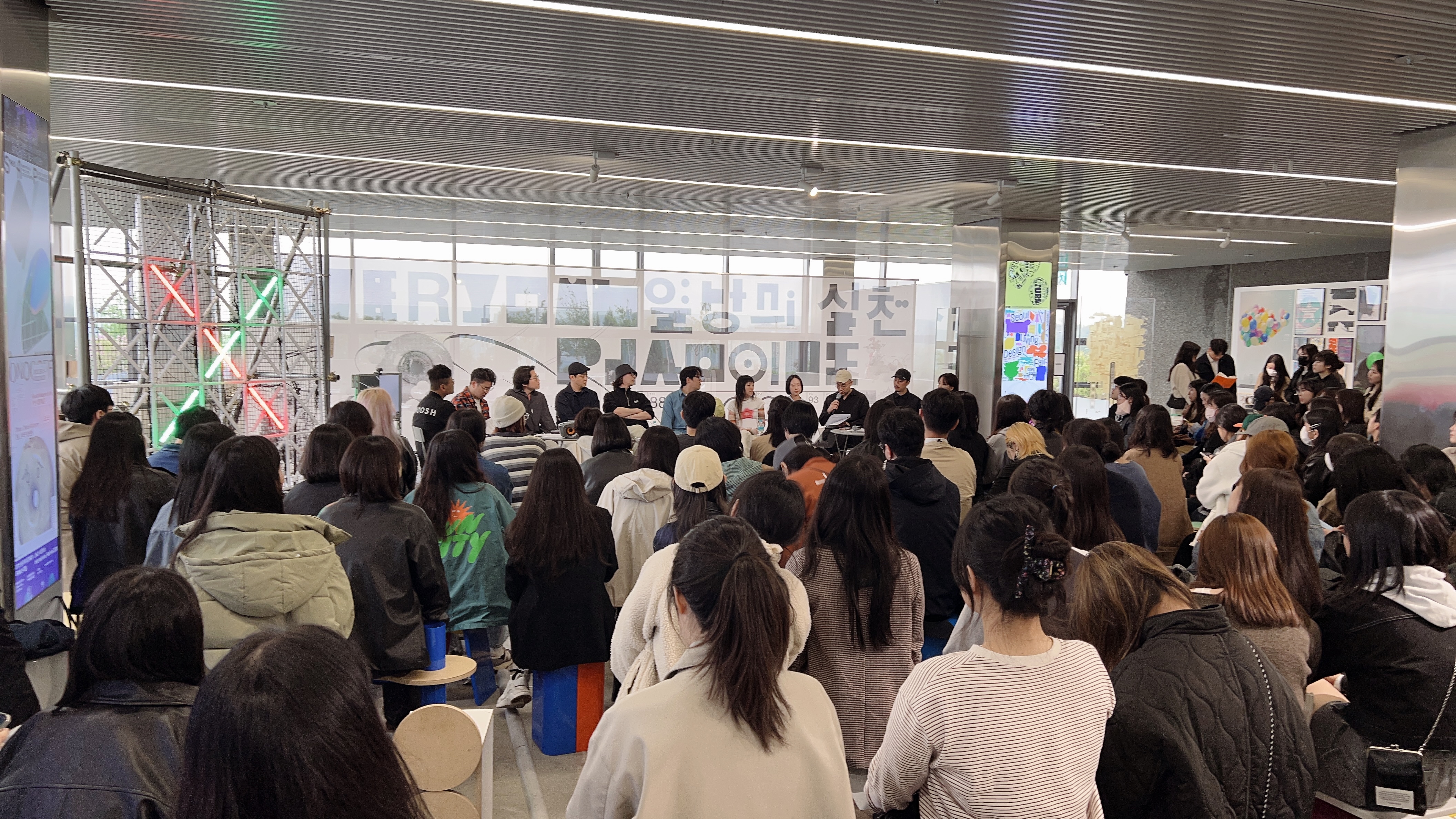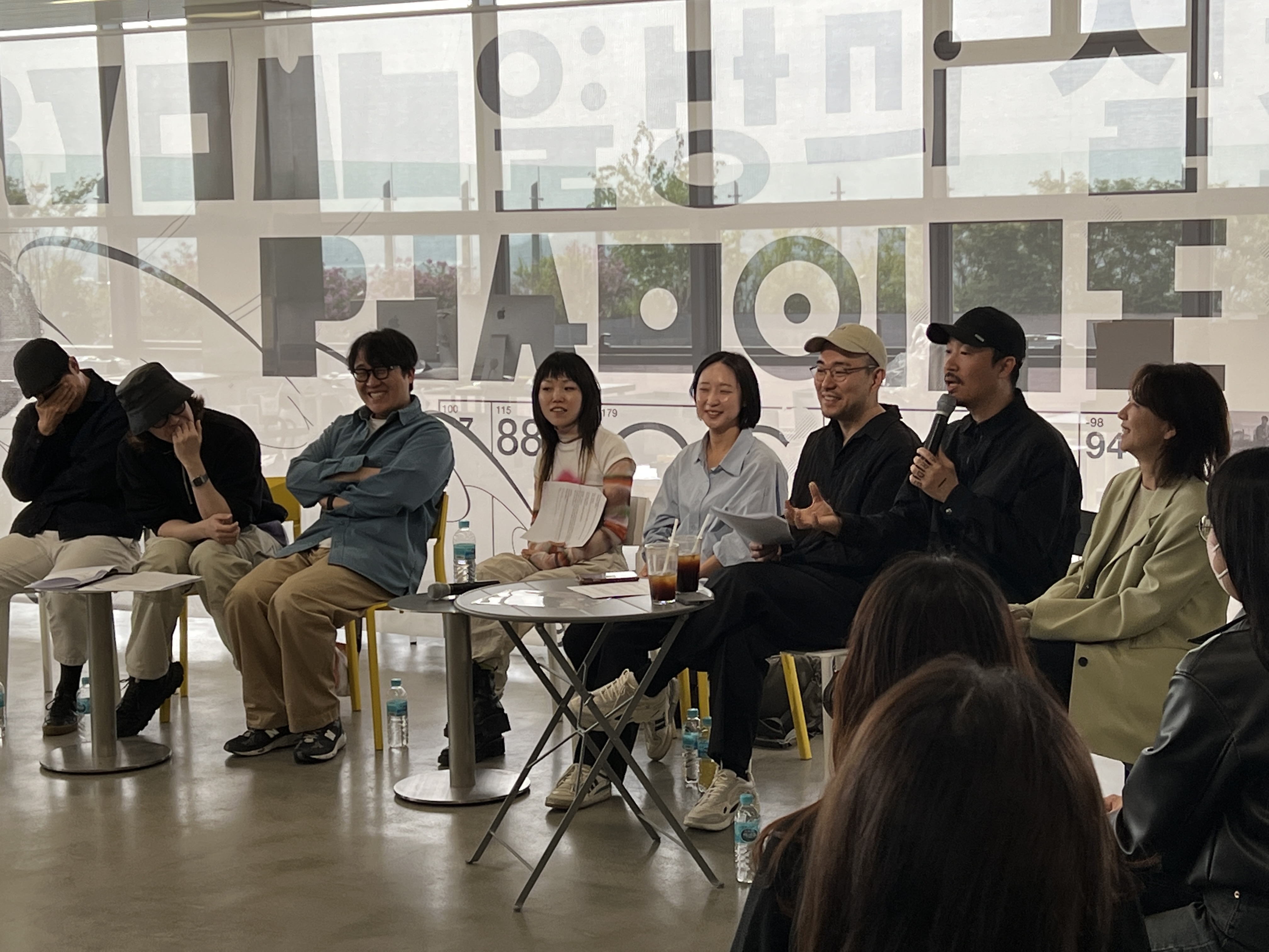 방문했던 29일(토)에는 **일상의실천 김어진님이 진행하고 5팀의 디자인 스튜디오가 함께 이야기를 나누는 전시연계 토크가 있던 날이었다. 인스타그램에서 미리 참여 신청을 받고 있었기에 당연히 못 들을 거라 생각했으나 공간이 오픈되어 있어서, 신청 없이도 토크를 들을 수 있었다. 공간이 별도 분리되지 않아서 전시를 보기에 집중이 어려웠고, 멀리서라도 들을 수 있다는 걸 알았다면 시간 맞춰서 갔을터라 매우 아쉬웠지만 짧게나마 '디자인 스튜디오의 현재와 미래'에 대한 의견을 듣고 공감할 수 있는 경험을 들을 수 있어서 즐겁고 손톱만큼의 유대감을 느꼈다.