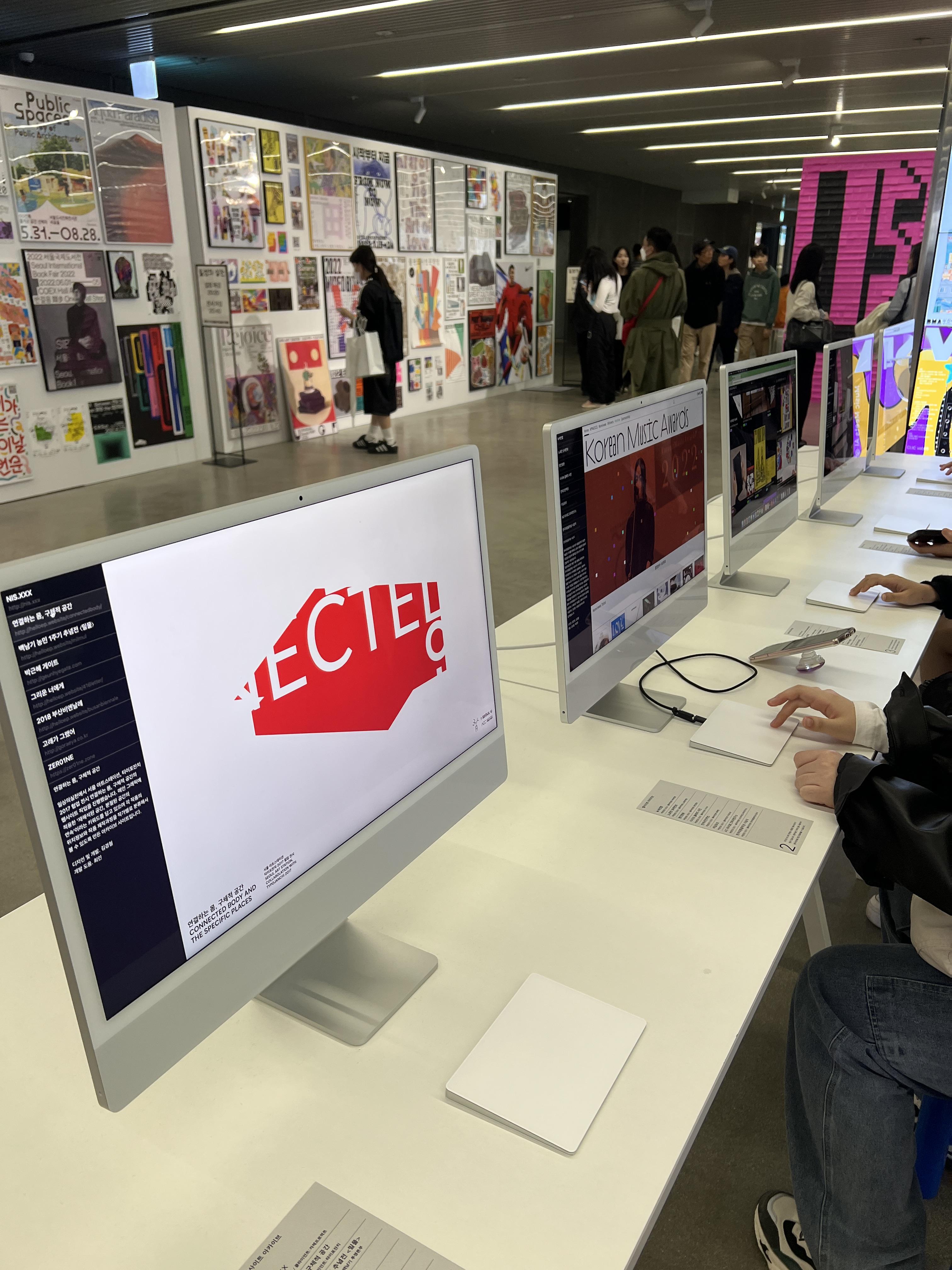 중앙에는 선별된 웹사이트를 볼 수 있는 PC가 5대 놓여져 있다. 5대 별로 볼 수 있는 웹사이트가 다르고 8개씩 큐레이션 되어 있다. 일상의실천 홈페이지에 아카이빙된 포트폴리오와는 별개로 만들어진 사이트처럼 보였다. 인터렉션이 새롭거나 마우스를 움직임에 따라 모션이 크게 보여지는 사이트가 많았다.