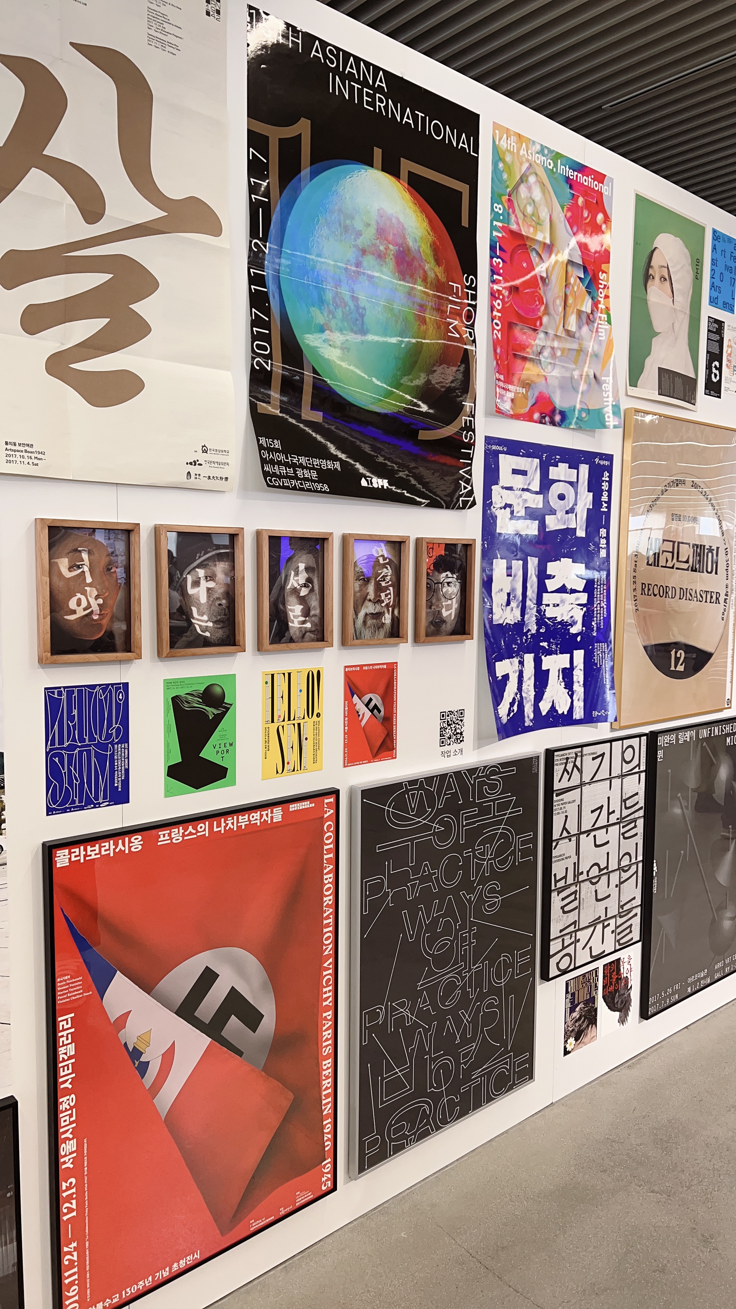 입구로 들어서면 보이는 우측 벽에는 포스터가 빈틈없이 빼곡하게 부착되어 있다. 참고로 **전시장의 작업물은 10년간의 모든 작품이 전시된 것은 아니고 3분의 1 정도 뿐만 있다만, 시간을 길게 들이지 않고서야 다 보기 어려울 정도로 작업물 양이 굉장히 방대했다. 대개 특정 예술가의 작품들을 보여줄 때는 그 예술가의 탄생부터 죽음까지의 타임라인에 따라 작품을 보여주거나 카테고리로 모아 보여주는 경우가 많으니까, 이 포스터들이 어떤 기준으로 배치되었는지 궁금했다. 스튜디오가 설립되고나서 현재까지의 순서대로 부착했다면 디자인 스타일이 어떻게 변화되어 왔는지 볼 수 있었을까?