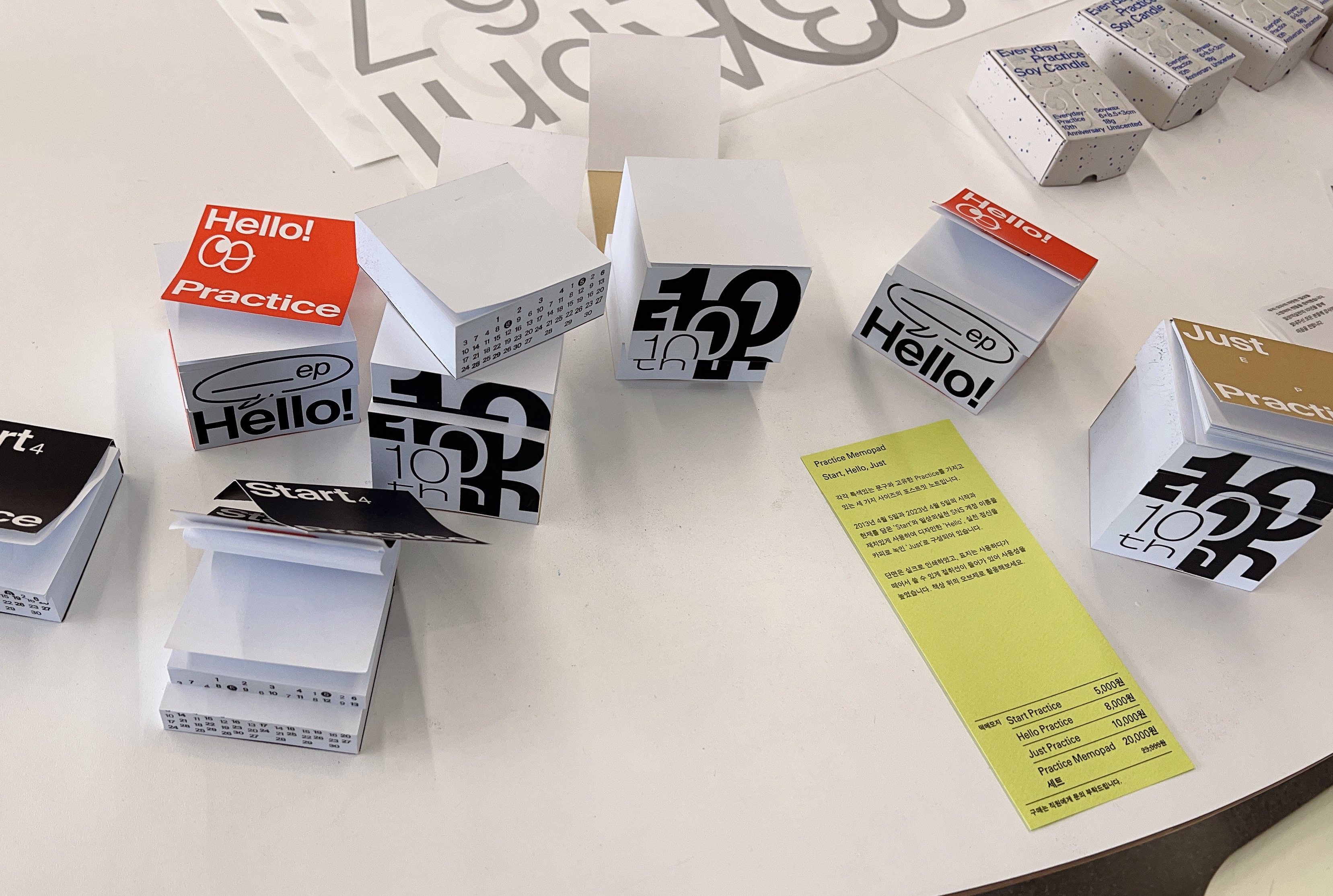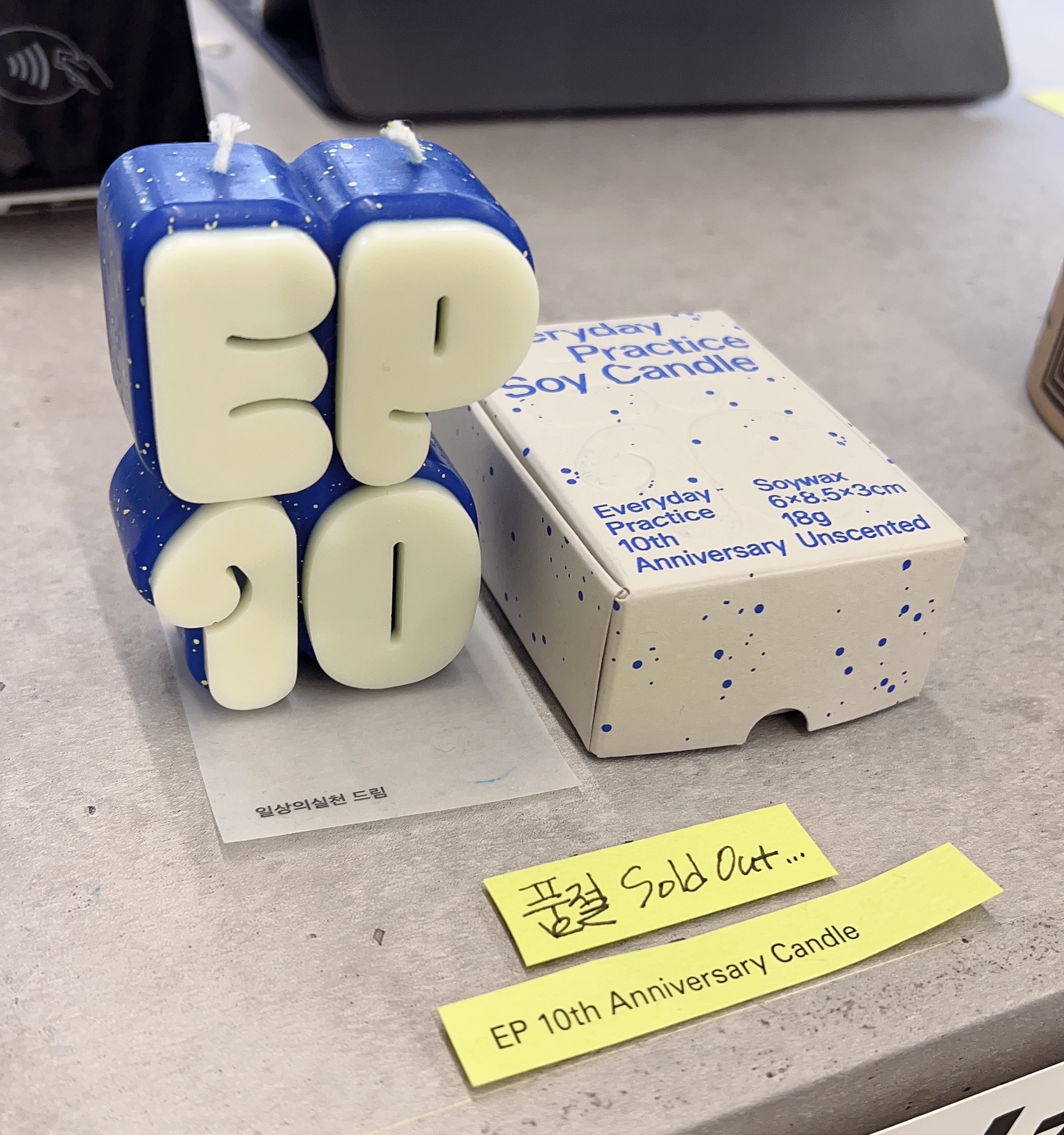10주년 기념 굿즈는 '일상의 물건'이라는 컨셉으로 만들어졌다. 노트, 떡메모지, 덕테잎, 포스터, 양초가 있고 취향에 따라 고를 수 있도록 몇 가지의 종류가 있다. 양초는 굿즈로 만들어진 경우를 많이 보지 못해 구입하려 했으나 역시나 품절. 다른 굿즈들도 지갑을 거덜나게 만들 수 있었지만.. 무언가를 쓰는(write) 실천보다 읽고 싶은 마음이 더 커서 에세이와 도록을 구입했다.