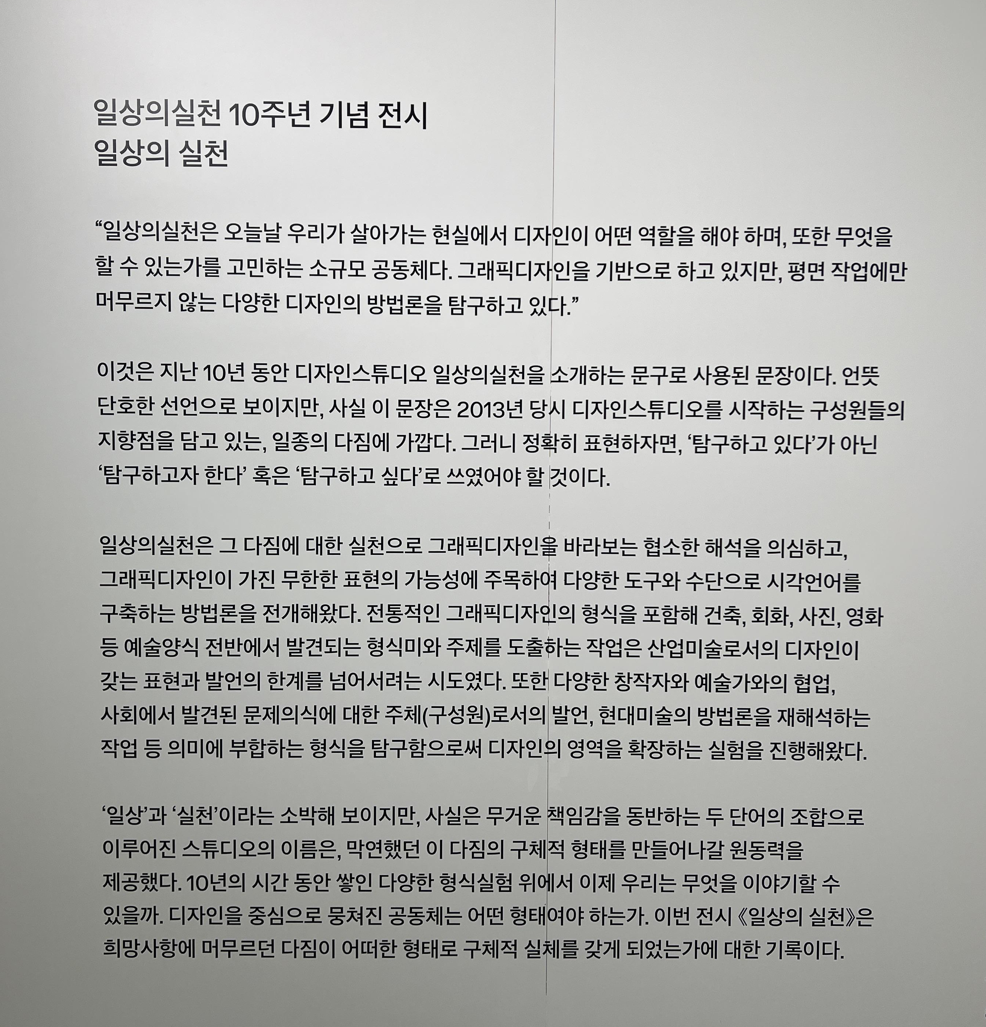 일상'과 '실천'이라는 소박해 보이지만, 사실은 무거운 책임감을 동반하는 두 단어의 조합으로 이루어진 스튜디오의 이름은, 막연했던 이 다짐의 구체적 형태를 만들어나갈 원동력을 제공했다. 10년의 시간 동안 쌓인 다양한 형식실험 위에서 이제 우리는 무엇을 이야기할 수 있을까. 디자인을 중심으로 뭉쳐진 공동체는 어떤 형태여야 하는가. 이번 전시 《일상의 실천>은 희망사항에 머무르던 다짐이 어떠한 형태로 구체적 실체를 갖게 되었는가에 대한 기록이다.