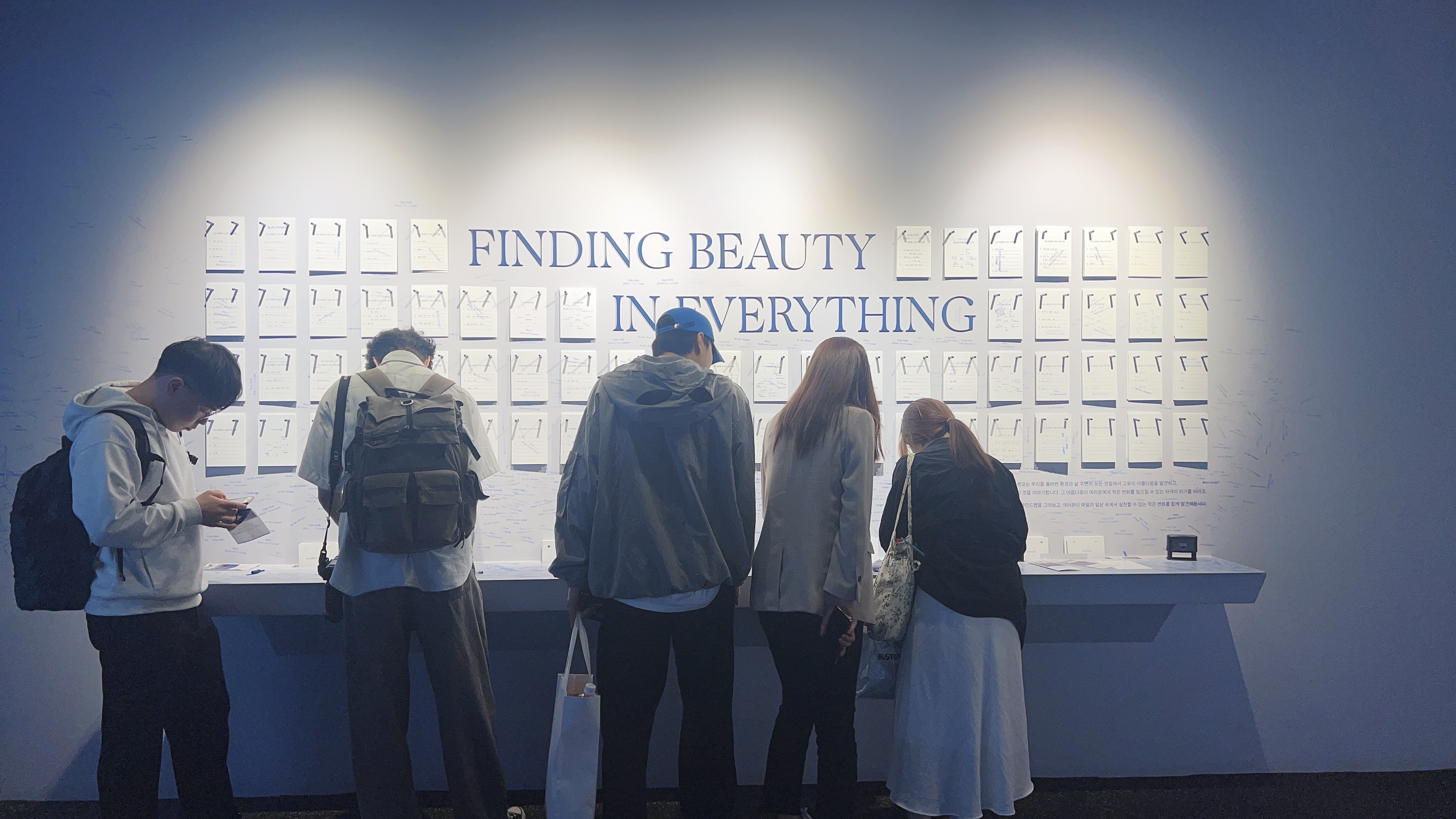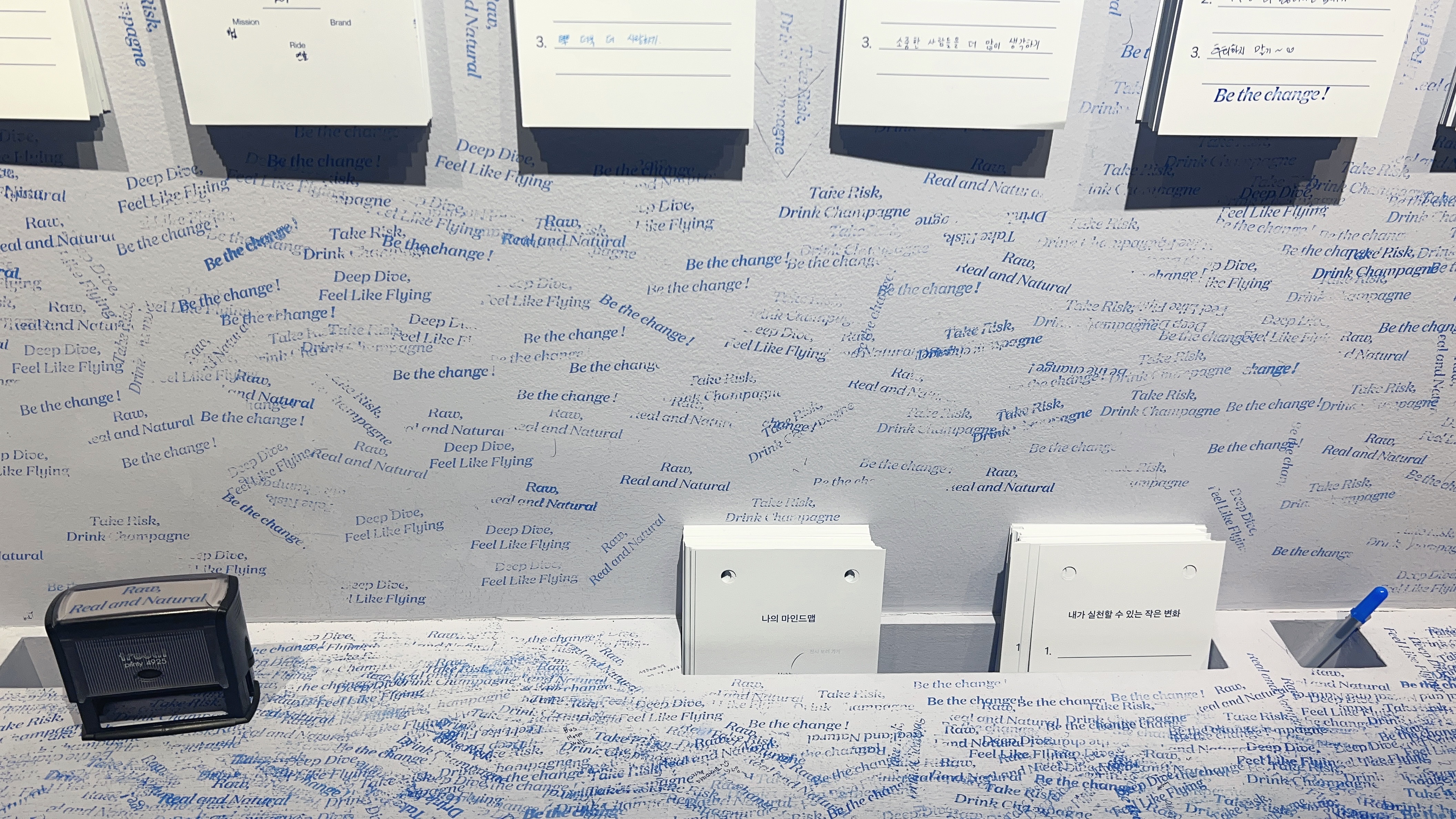 마지막 공간은 작가에 대한 마인드맵이 그려진 공간에서 관람자의 마인드도 적을 수 있는 공간이 있다. 평소에는 아무렇지 않을 문장들, Be the change, Deep Dive, Freel like flying, Take Risk 등등. 전시를 보고나니 도장의 멘트가 설렜다. 내 인생의 마인드맵을 이렇게 정리될 수 있을까. 얼마나 많은 글이 관람자들의 마음에 새겨졌을까. 아쉽지만 나는 적지 않고 종이만 가져왔다.