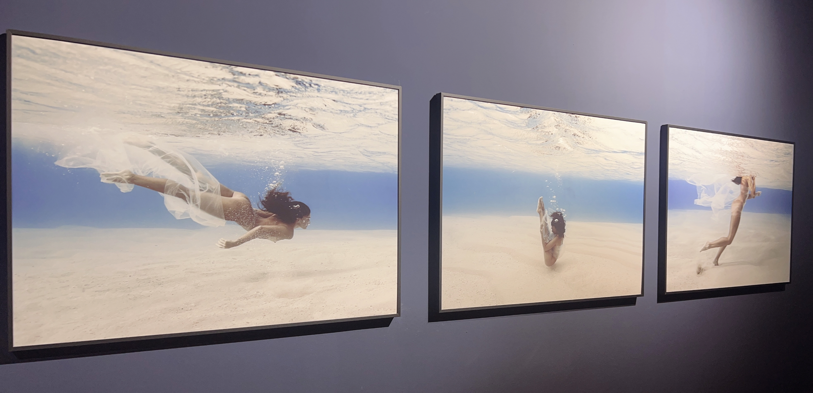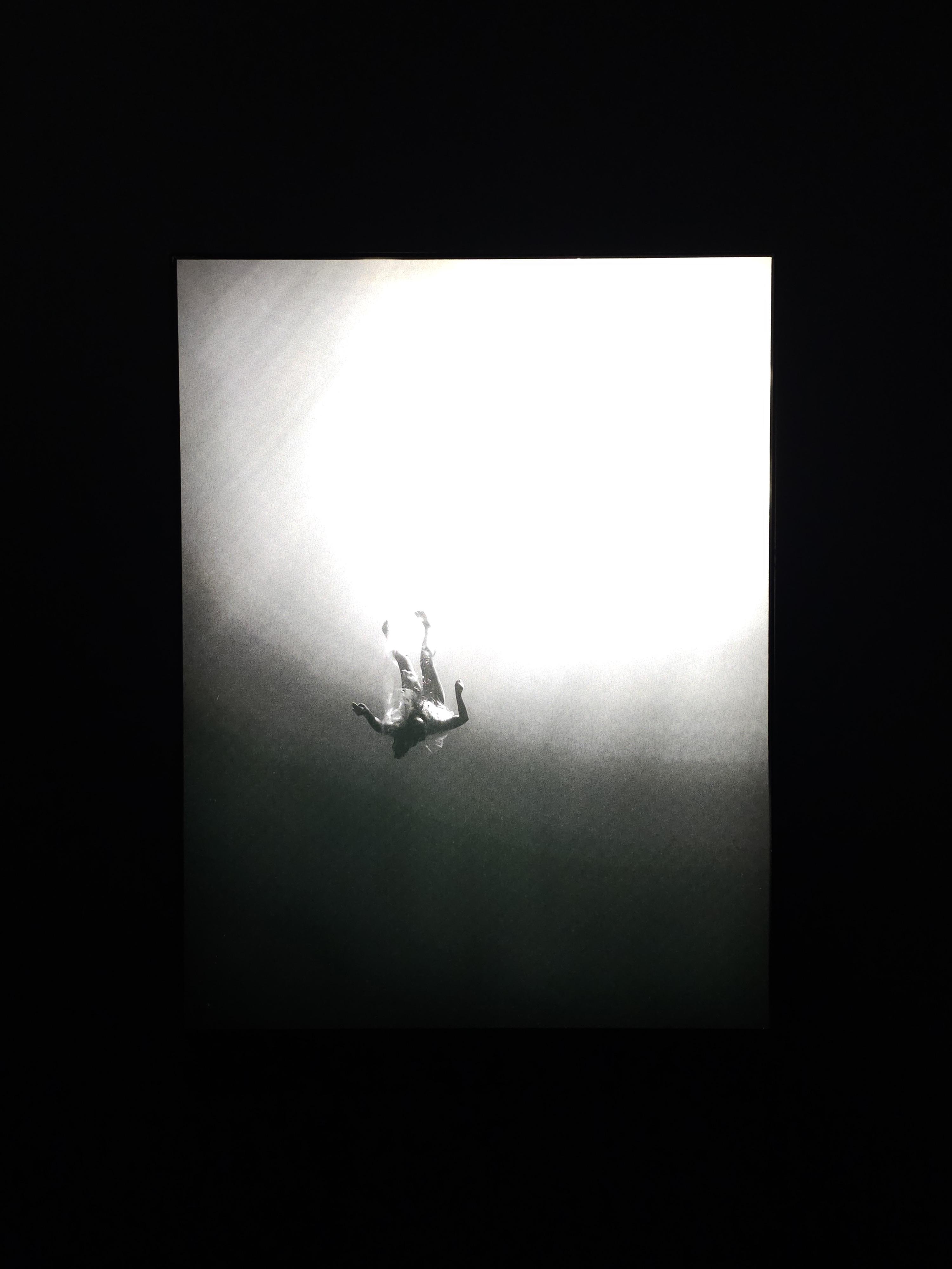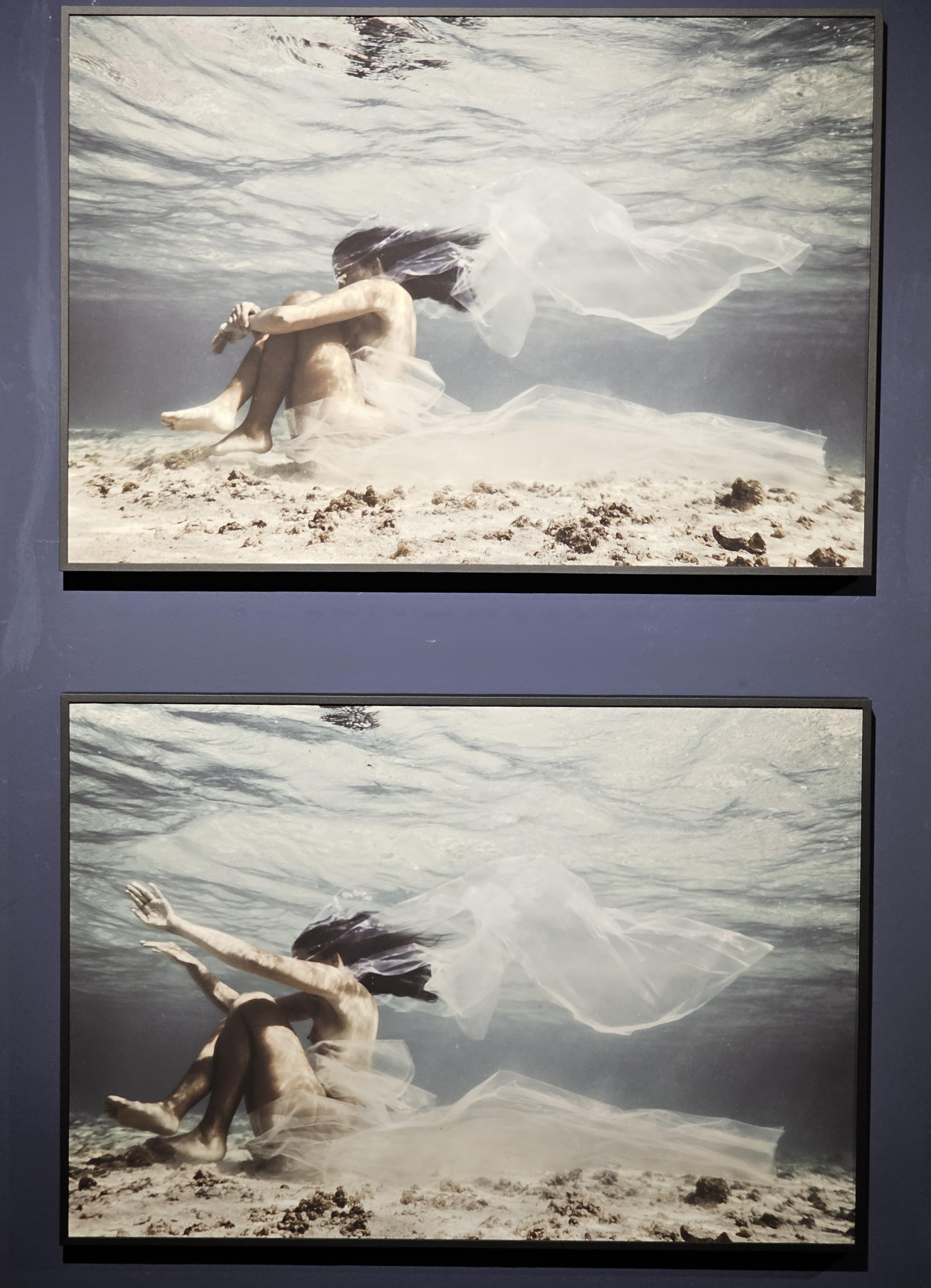 전시장으로 들어서서 가장 먼저 보이는 작품(Falling Deep)부터 시선을 사로잡았다. 바다로 빠져드는 사람의 모습이 처음에는 자유롭고 아름다워 보였다. 동행자와 '작품을 방에 걸어두고 싶다'는 이야기도 했는데 그 곳에서 들었던 고요한 배경음악과 어두운 조명 때문이었는지는 몰라도, 계속 보고 있자니 슬픈 감정이 들었다. 수면 너머 불투명하게 퍼지는 빛, 묶인 것처럼 웅크러든 또는 사지가 풀어진 듯한 모델의 포즈, 생명이라고는 보이지 않는 바다 때문이었던 것 같다. 전시가 끝난 후에 따로 들었던 도슨트 설명에서는 비닐에 감겨 바닷속으로 떨어지는 사람의 모습과 그 너머에, 비슷한 모습으로(플라스틱 오염으로) 목숨을 잃는 생명을 떠오르게 한다는 설명이 있다.