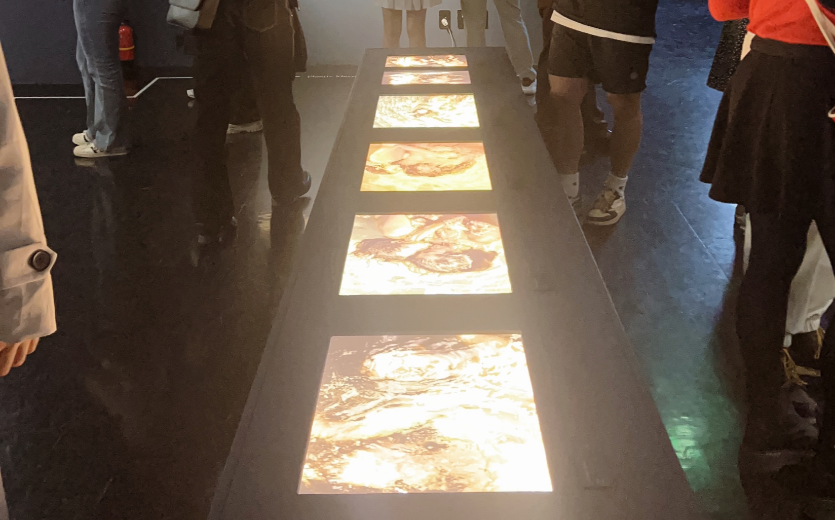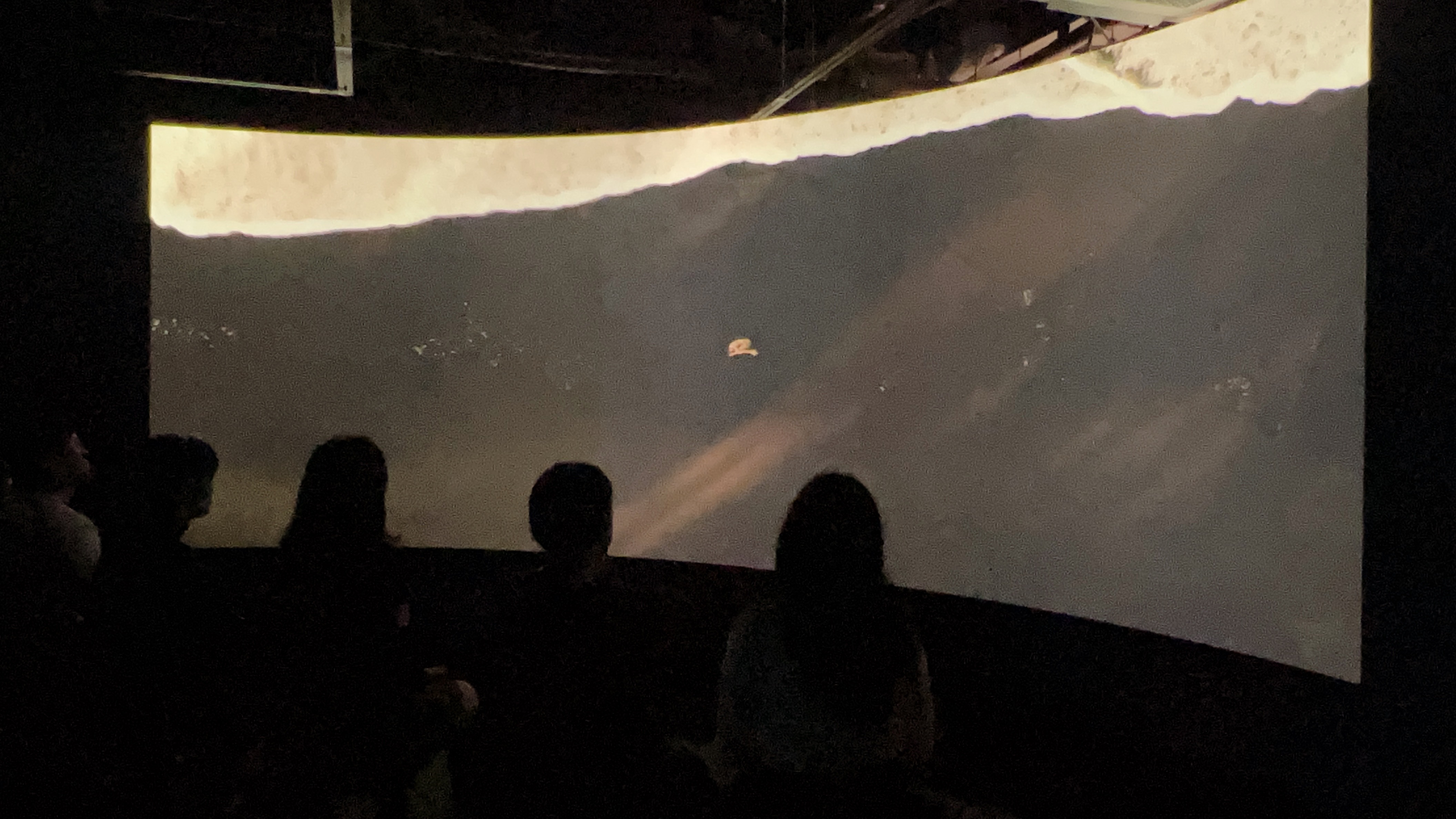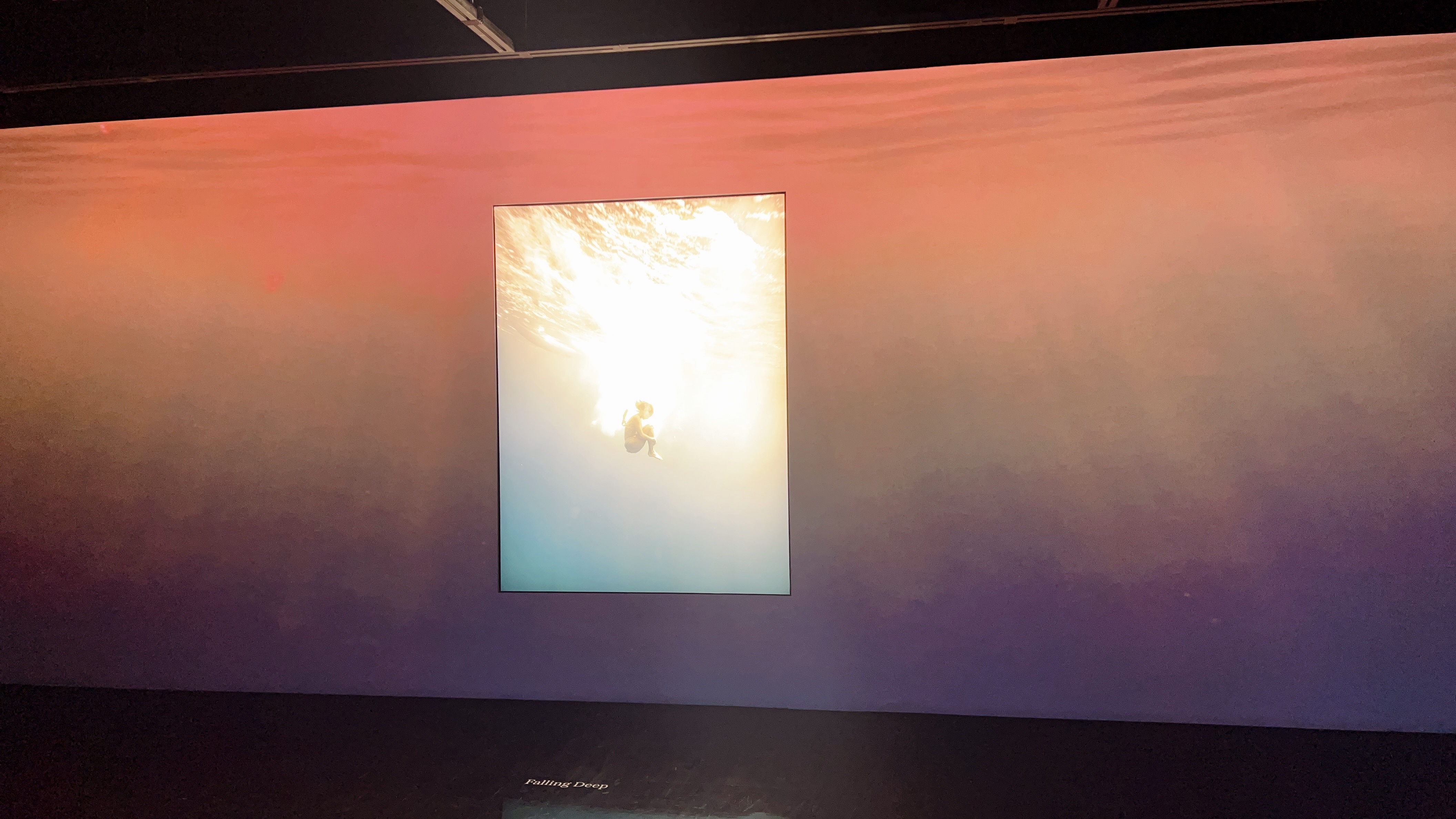 전시장 입구에서 제일 넓은 공간을 차지하는 Falling Deep 작품, 수면 아래 빛이 산란되는 아름다운 배경이 영상으로 보여진다