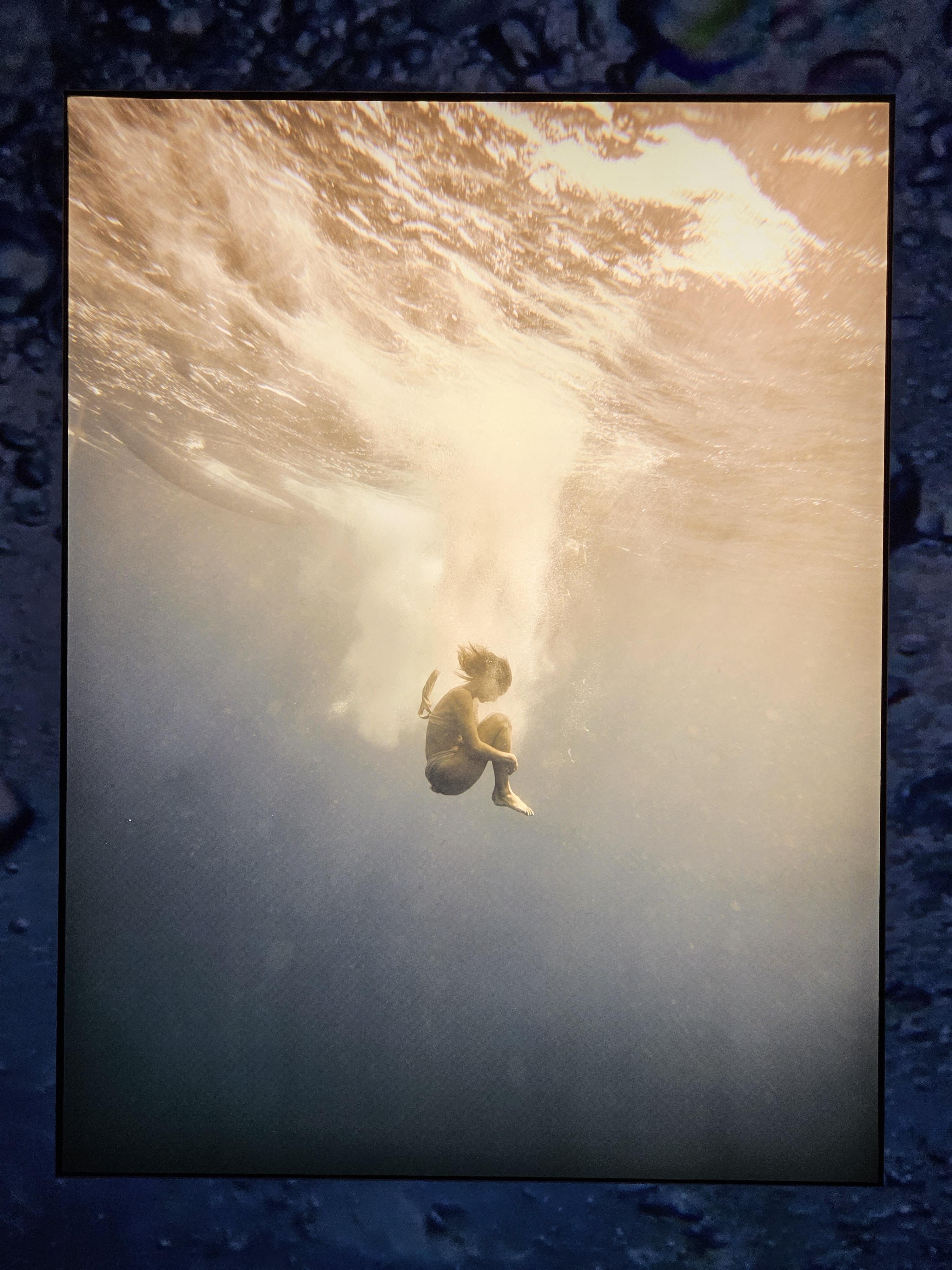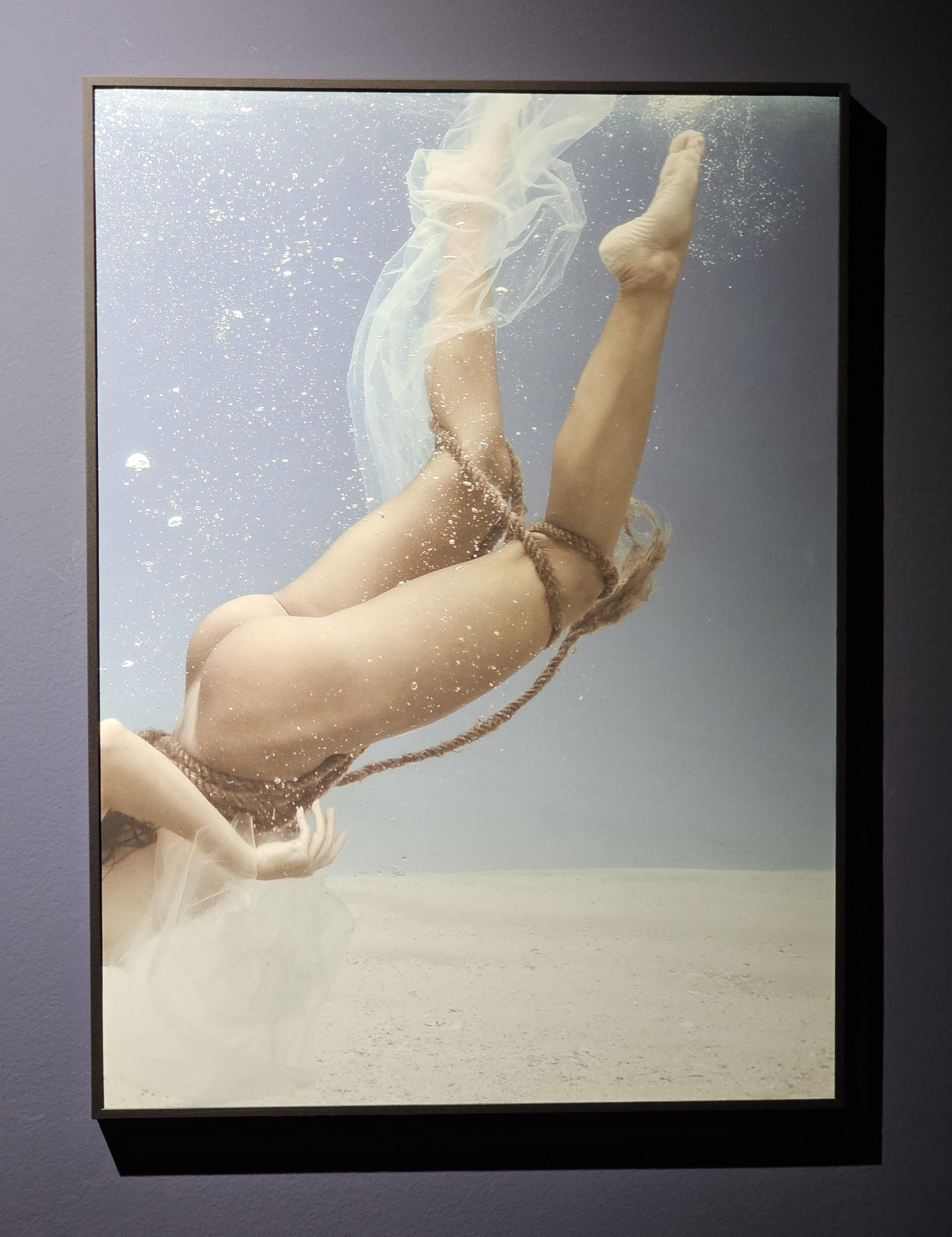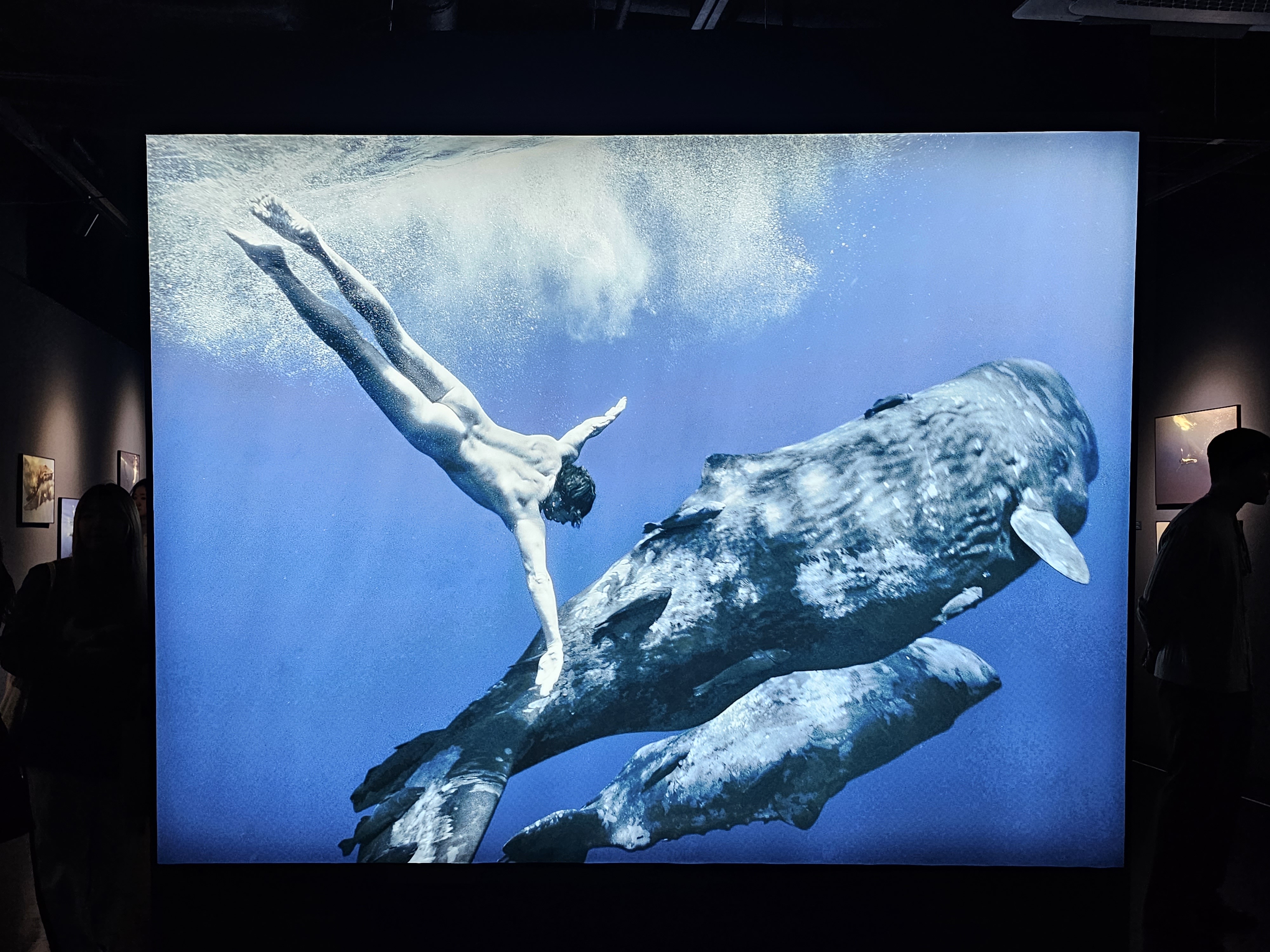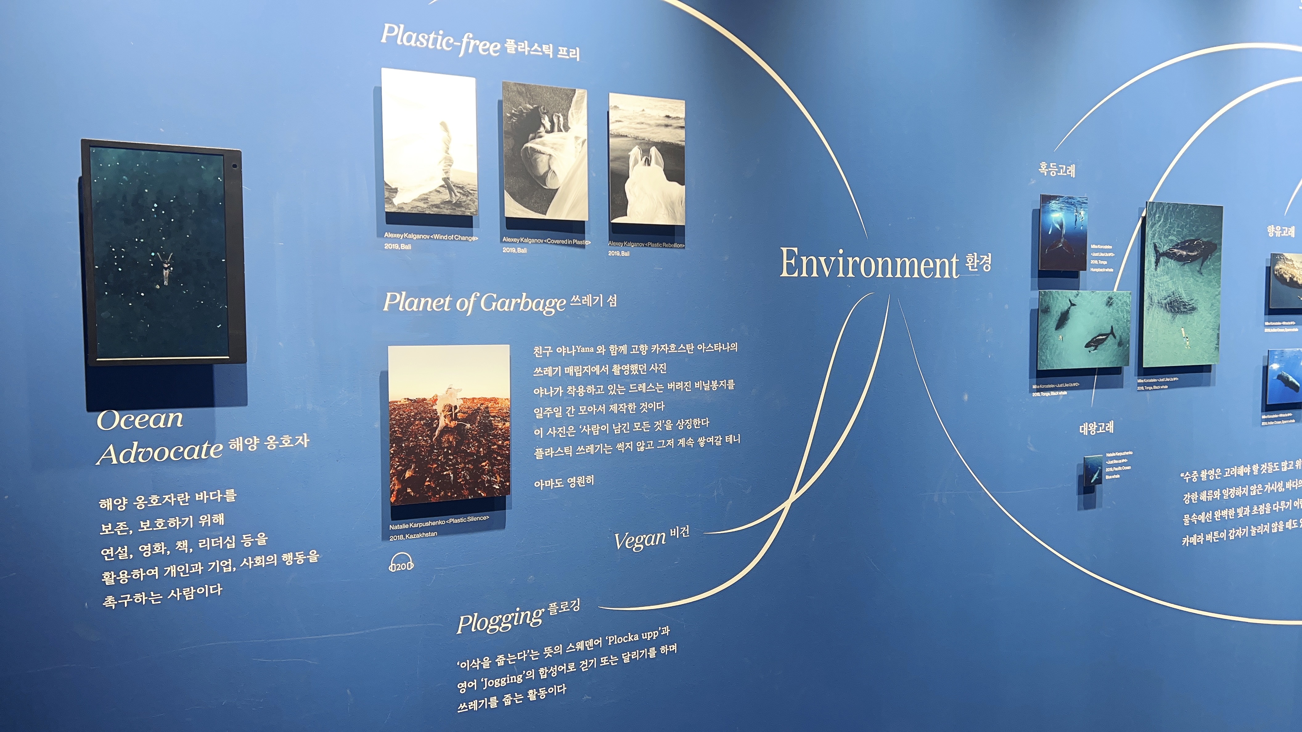 전시장으로 들어서서 가장 먼저 보이는 작품(Falling Deep)부터 시선을 사로잡았다. 바다로 빠져드는 사람의 모습이 처음에는 자유롭고 아름다워 보였다. 동행자와 '작품을 방에 걸어두고 싶다'는 이야기도 했는데 그 곳에서 들었던 고요한 배경음악과 어두운 조명 때문이었는지는 몰라도, 계속 보고 있자니 슬픈 감정이 들었다. 수면 너머 불투명하게 퍼지는 빛, 묶인 것처럼 웅크러든 또는 사지가 풀어진 듯한 모델의 포즈, 생명이라고는 보이지 않는 바다 때문이었던 것 같다. 전시가 끝난 후에 따로 들었던 도슨트 설명에서는 비닐에 감겨 바닷속으로 떨어지는 사람의 모습과 그 너머에, 비슷한 모습으로(플라스틱 오염으로) 목숨을 잃는 생명을 떠오르게 한다는 설명이 있다.