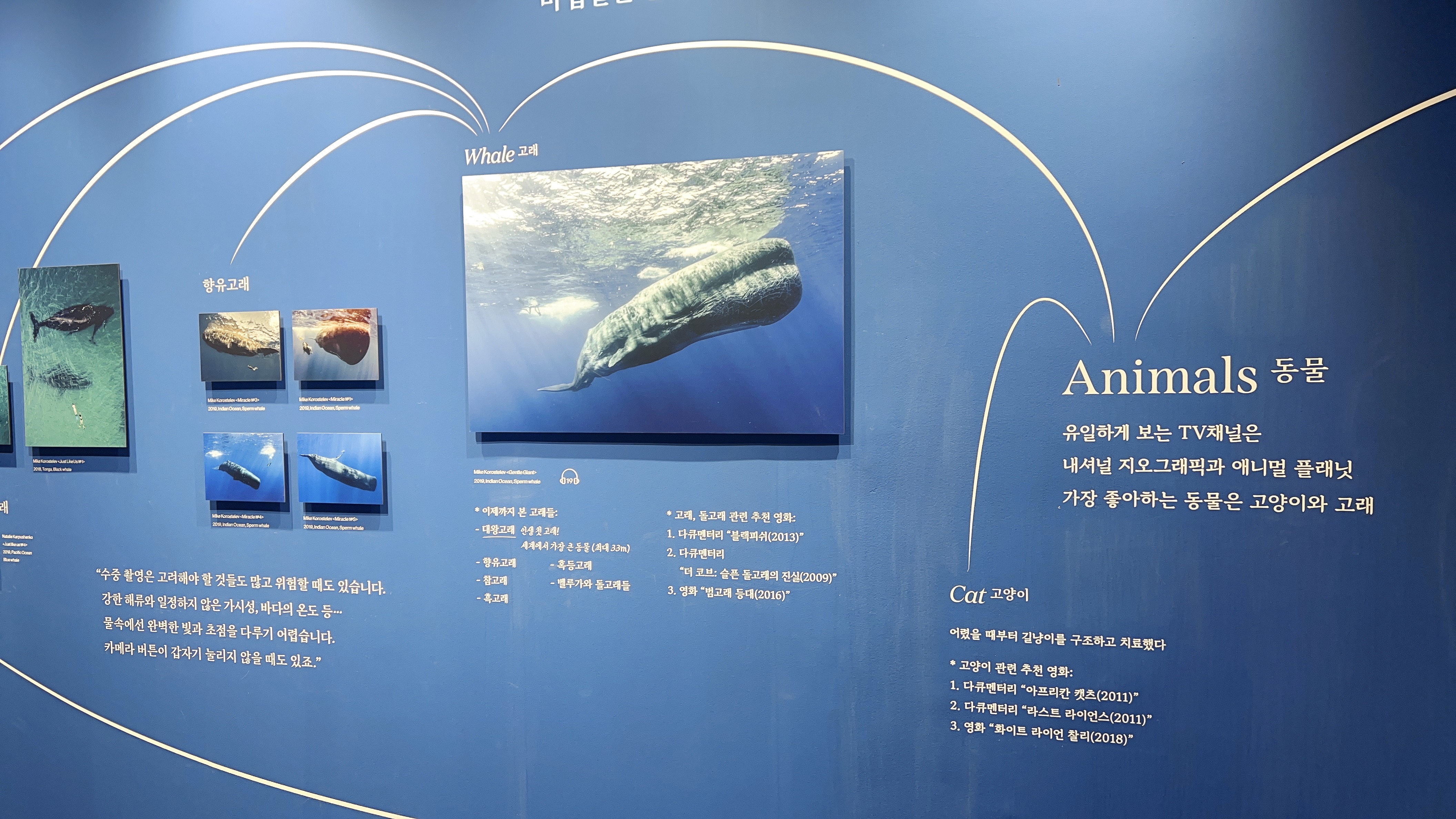 장난치기를 좋아하고 호기심이 많은 혹등고래는 **인간과 교류를 할 수 있는 친근한 고래에 속하고 함께 수영할 수 있는 기회가 꽤 흔하다고 한다. 도슨트는 모델이 다이빙을 하는 모습을 놀이라고 생각하고, 잠수복을 입지 않은 모습을 호기심 가득한 눈으로 바라본다고 이야기한다. 아래의 아티클에서 혹등 고래의 가장 인상적인 특징 중 하나로 '다른 개체들과의 의사소통 역할을 하는 것으로 생각되는 소리를 내뿜으며 노래를 한다'고 설명한다. 혹등고래는 30분 이상 길게 노래를 하는 고래로도 유명하다고 해서, 덩치는 커도 너무 귀엽고 사랑스러운 동물이라고 생각했다.