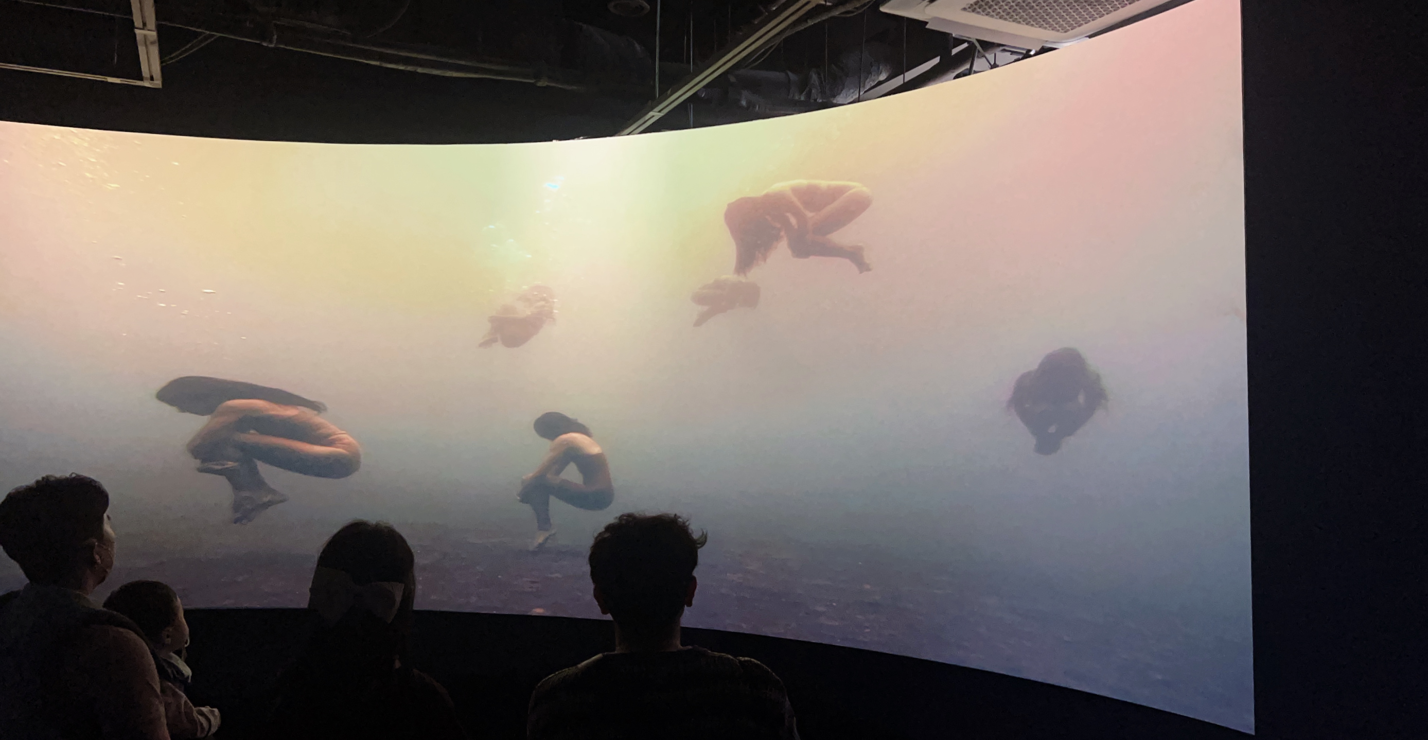 전시장 입구에서 제일 넓은 공간을 차지하는 Falling Deep 작품, 수면 아래 빛이 산란되는 아름다운 배경이 영상으로 보여진다