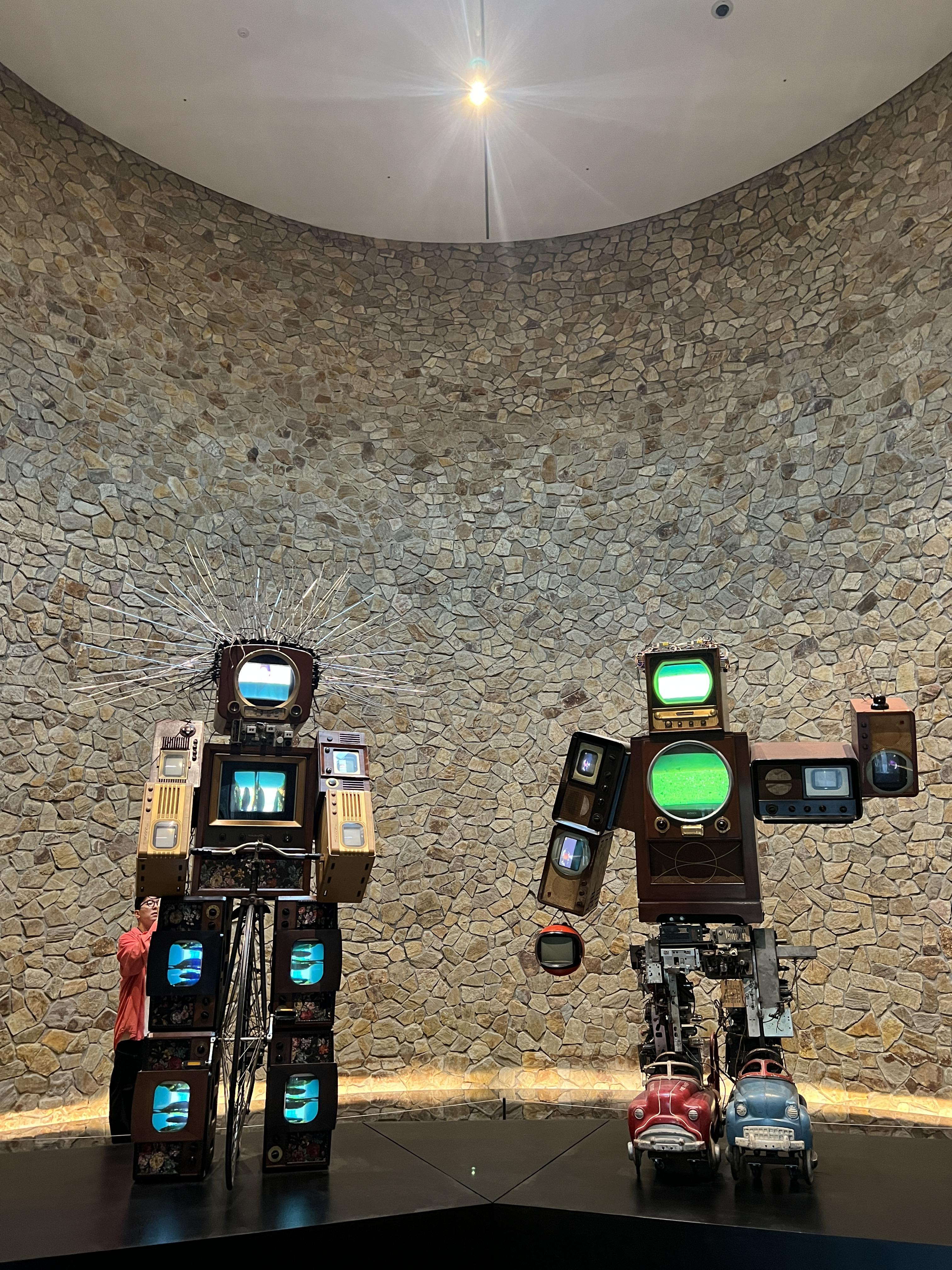 백남준 작품은 수리가 필요한 경우 브라운관의 더이상 부품을 구하기가 쉽지 않아서 유지보관이 점점 어려워진다고 했다. 원형코트 안에 네모난 모양의 기계가 의외의 조합으로 보인다.