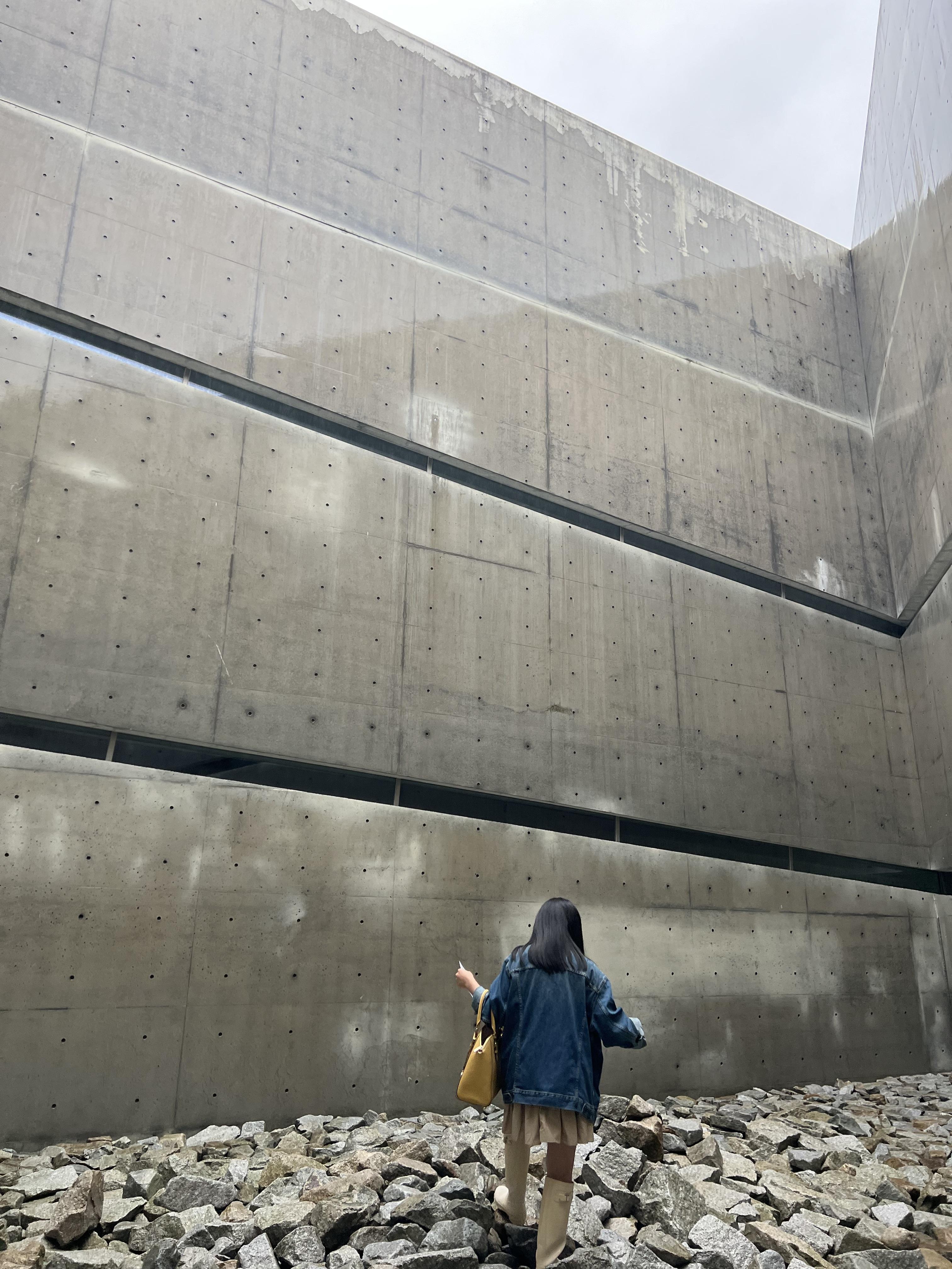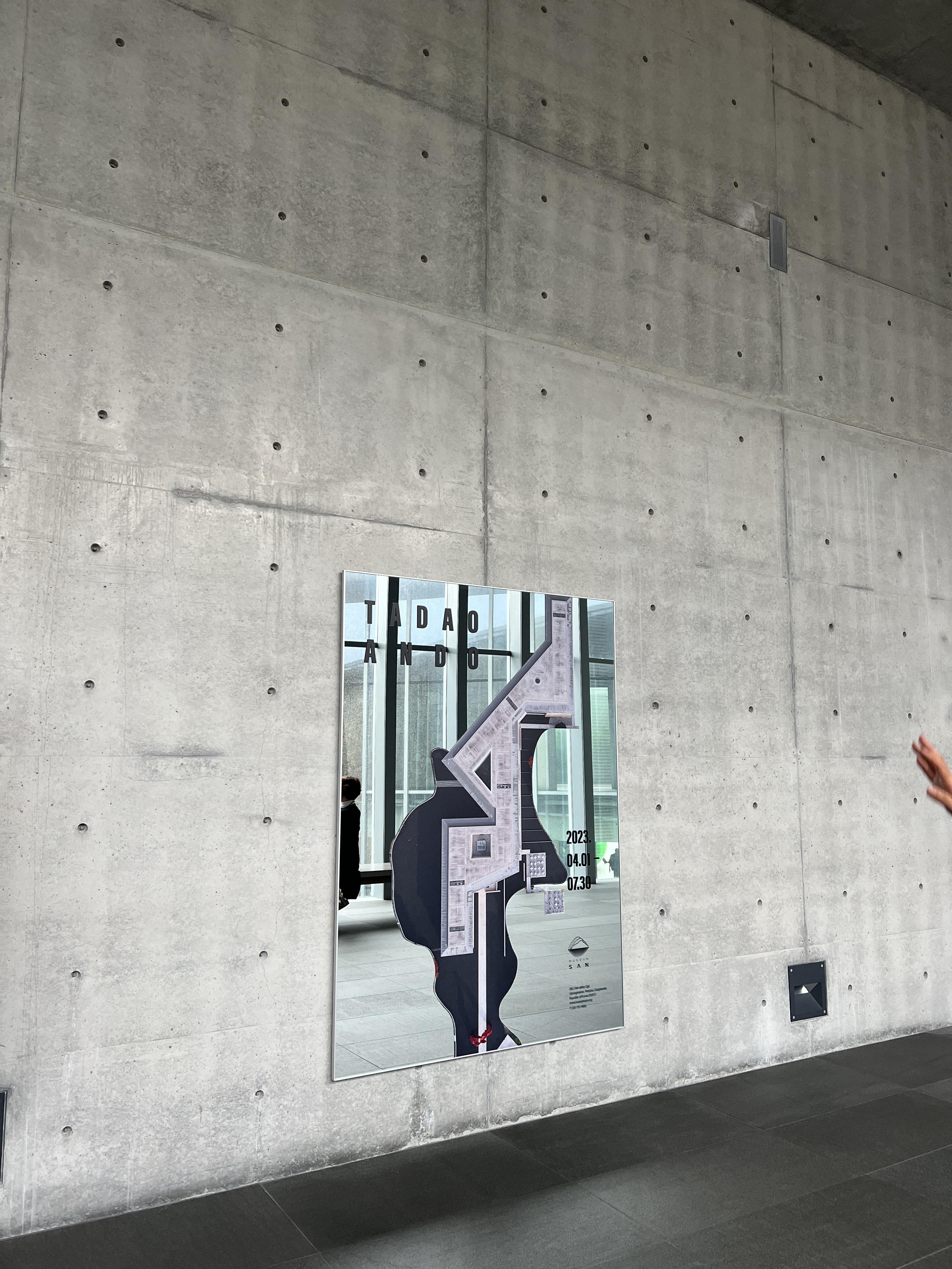 본관으로 가기 전부터 안도 타다오의 트레이드 마크인 노출 콘트리트 건축물이 보인다. 노출 콘크리트는 다른 외부 재료를 사용하지 않고 콘크리트를 그대로 드러내는 건축 기법이다. 1950년대 영국에서 시작되었고 르 코르뷔지에가 이 기법을 사용하면서 세계적으로 알려졌다. 표면의 동그랗고 작은 원이 반복되는 게 안도 타다오의 트레이드 마크인가? 싶어 동행했던 친구와도 짐작해보았는데, **거푸집을 고정하기 위한 볼트가 있던 구멍인 것 같다. 다른 건축 예시 사진을 보면 콘크리트 사이의 분할된 줄눈자국이 눈에 띄게 보이는데, 뮤지엄산의 건축물은 굉장히 깔끔했던 것 같다.