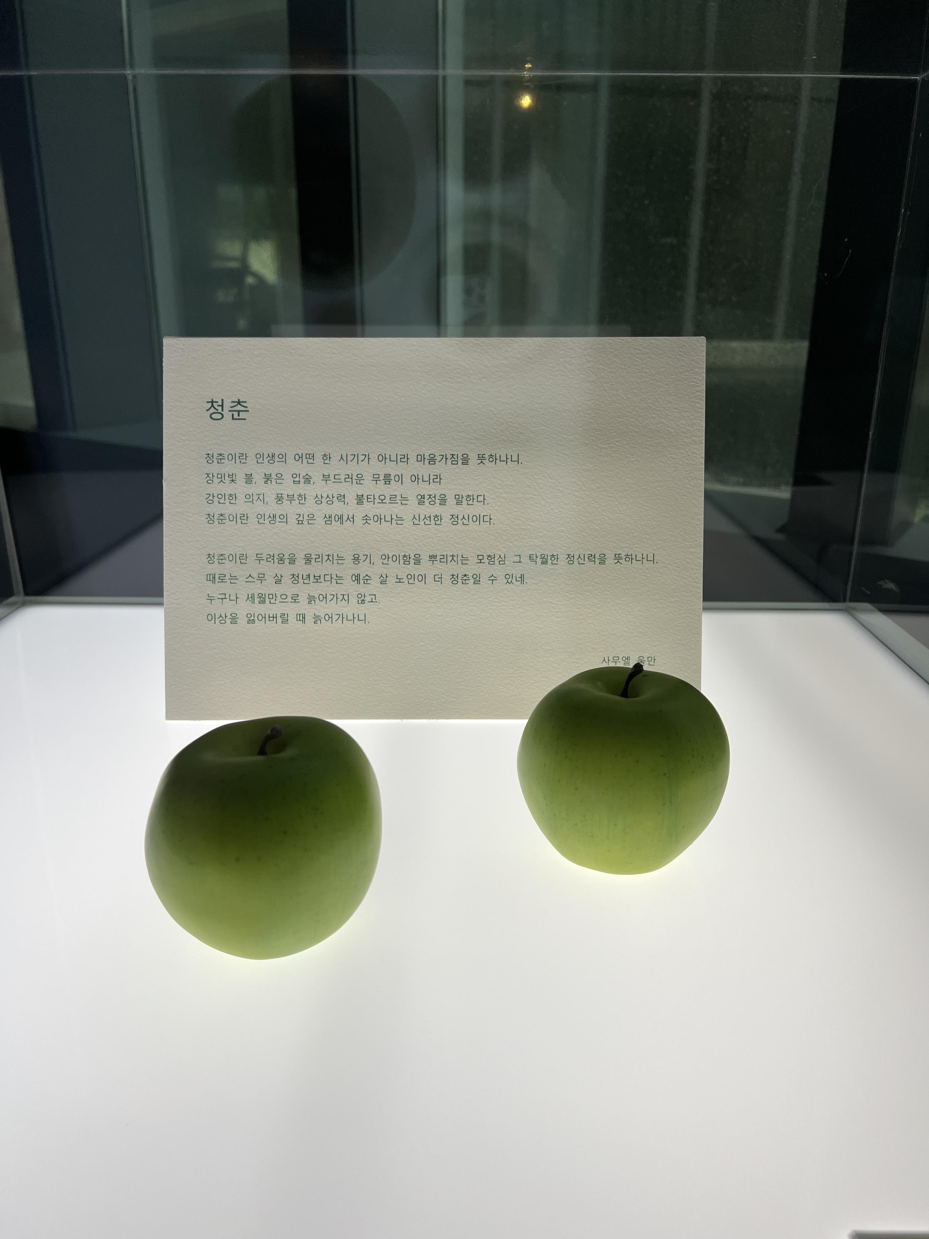 푸른 사과를 만지면 한 살씩 어려질 수 있다는 할아버지 건축가의 말에 사과를 크게 안고 왔다. 처음에는 마치 외계인과 소통한다는 빵상 아주머니나 내 눈을 바라보면 행복해진다는 허경영님의 노래처럼 우스운 말로 들렸지만, 그가 영감을 받았다던 사무엘 울만의 시를 읽고는 생각이 바뀌었다. 안도 타다오는 사과도 사람도 푸른 사과처럼 무르익기 전, 미숙할 때 내일을 향한 희망을 가장 많이 품고 있다고 말했다. 희망을 품고 산다는 것, 청춘의 마음가짐 아닐까 생각하면서 건축물을 감상했다.